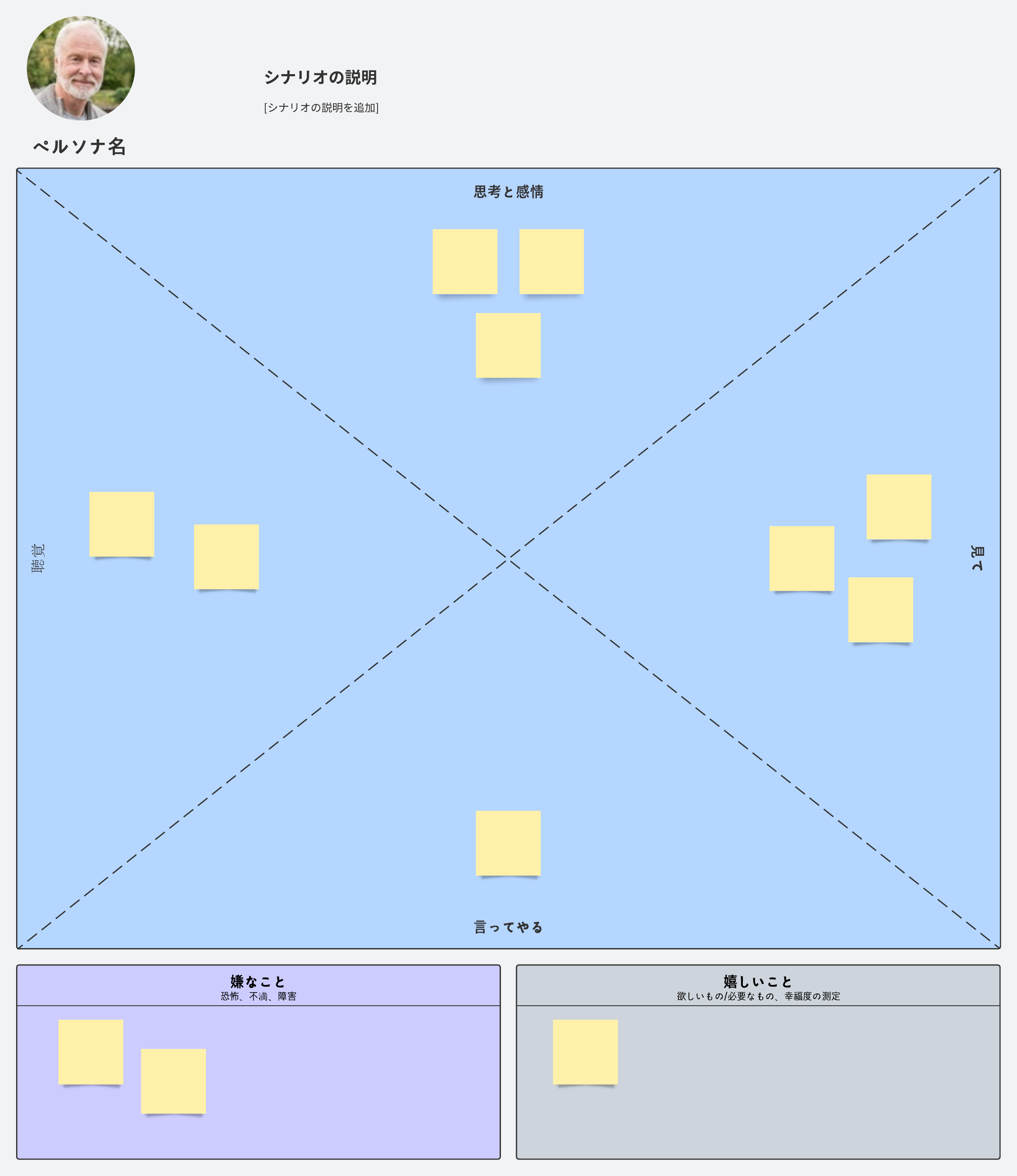 共感マップ(Empathy Map)とは、ユーザーやターゲットとなる人々の思考、感情、行動などを深く理解するためのツールで、特に製品開発やマーケティング、ユーザー体験の向上を目的としたプロセスで使用されます。定性的なデータを整理し、ユーザーのニーズをより深く理解するため、ユーザーの言動や思考に関する情報を捉え、カスタマーエクスペリエンスの改善に活かす上で共感マップ テンプレートが役立ちます。