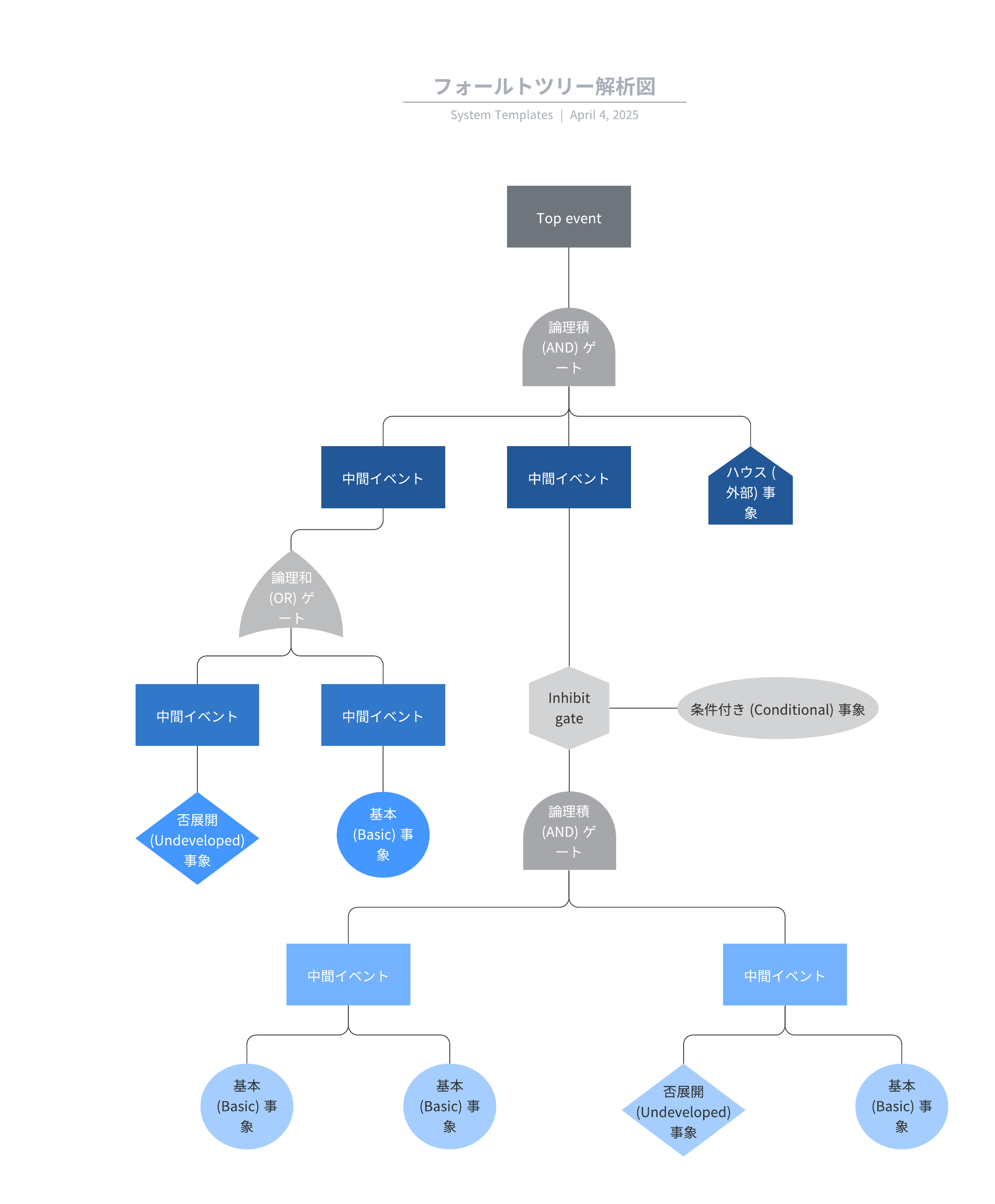 用途に合わせてフォールトツリー解析図をカスタマイズするには、このテンプレートを開き、コンテンツを追加します。