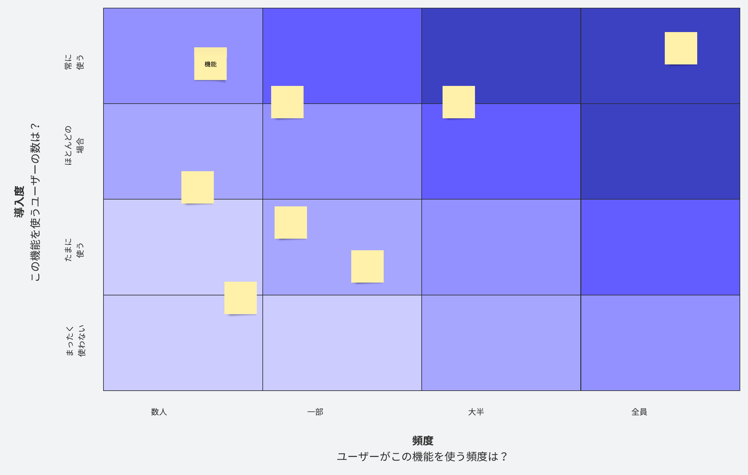 最も重要な機能に注力するには機能監査が役立ちます。頻度と導入度に応じて、機能を図に追加しましょう。