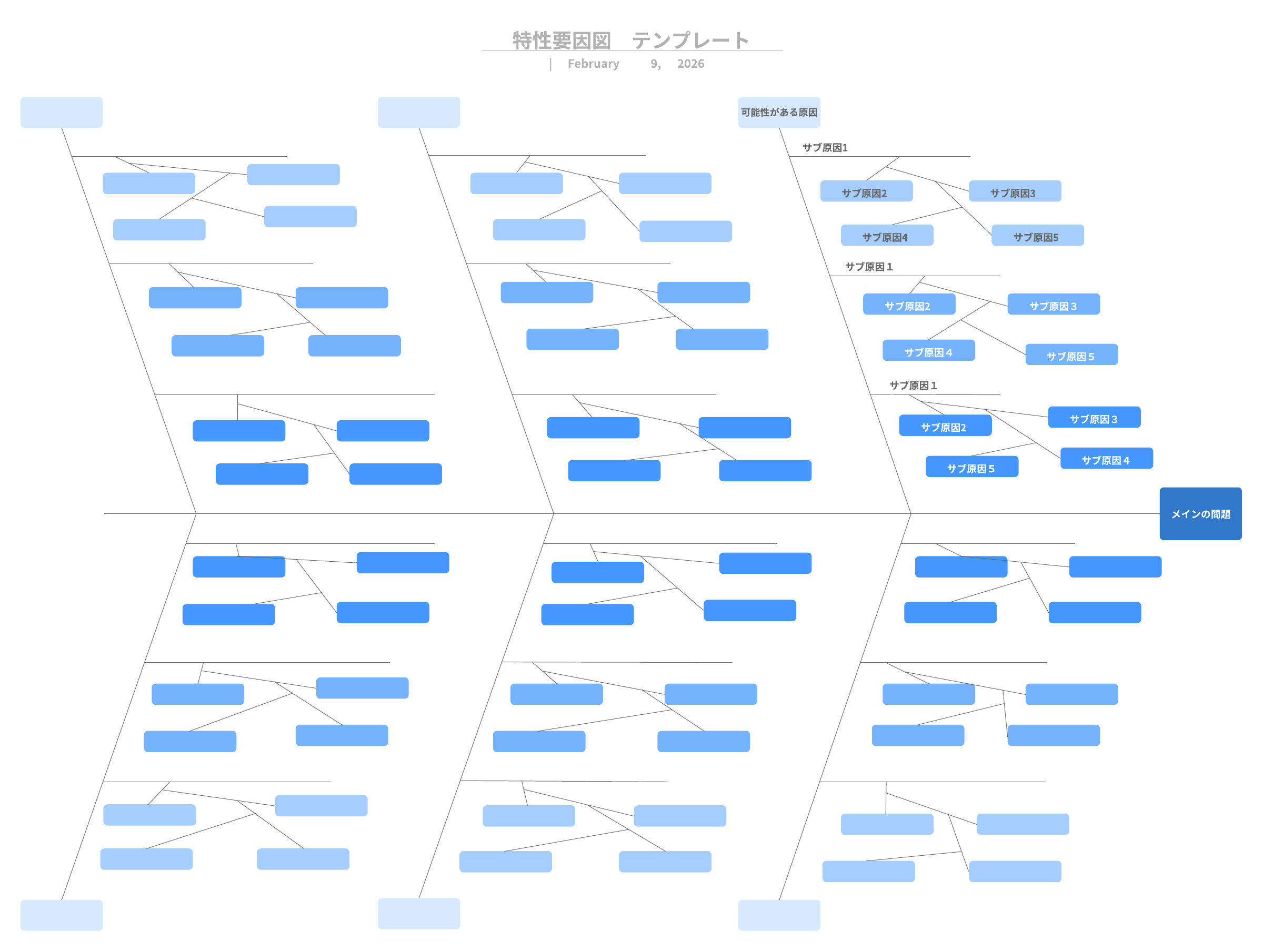 このテンプレートを開き、ユースケースに合わせてカスタマイズ可能な特性要因図の例を詳しく確認してみましょう。