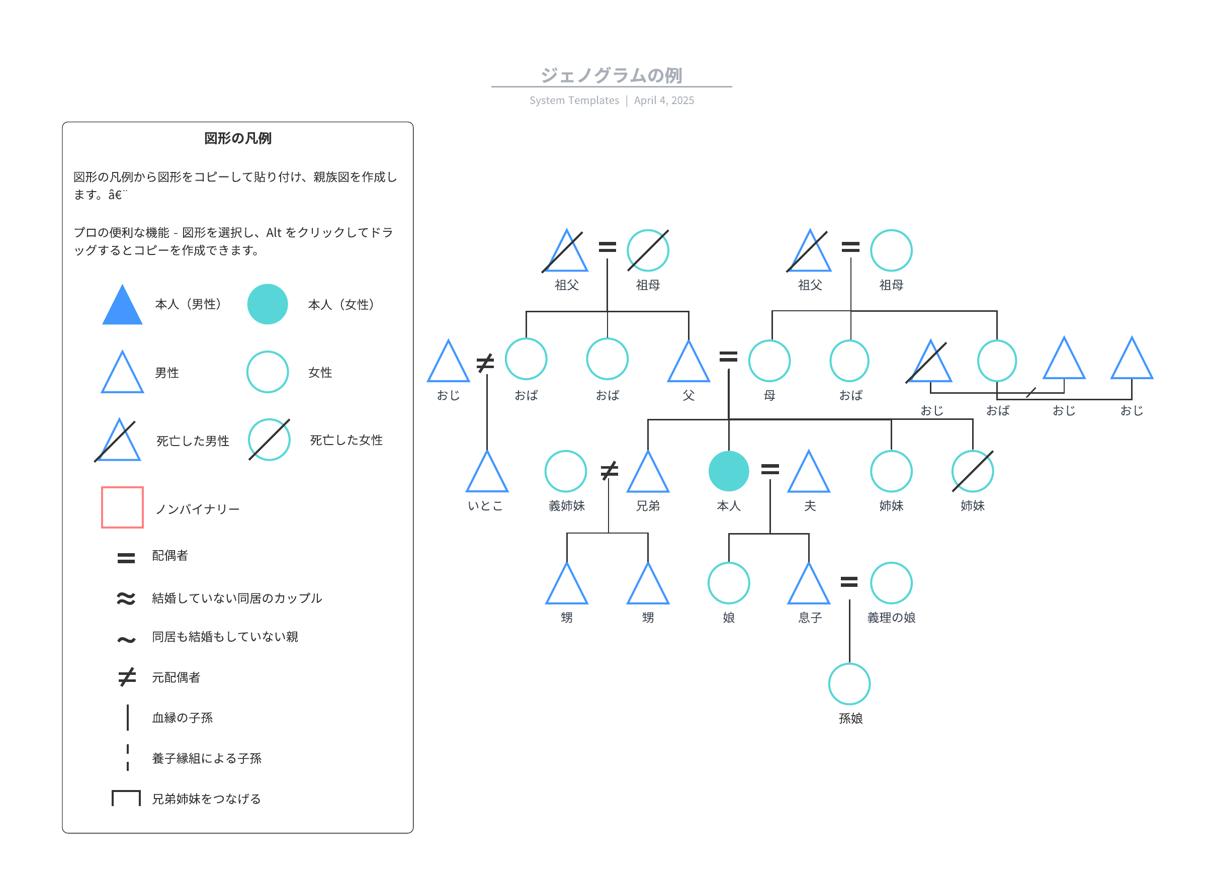 - 親族図に使用される基本的な記号にアクセスする。