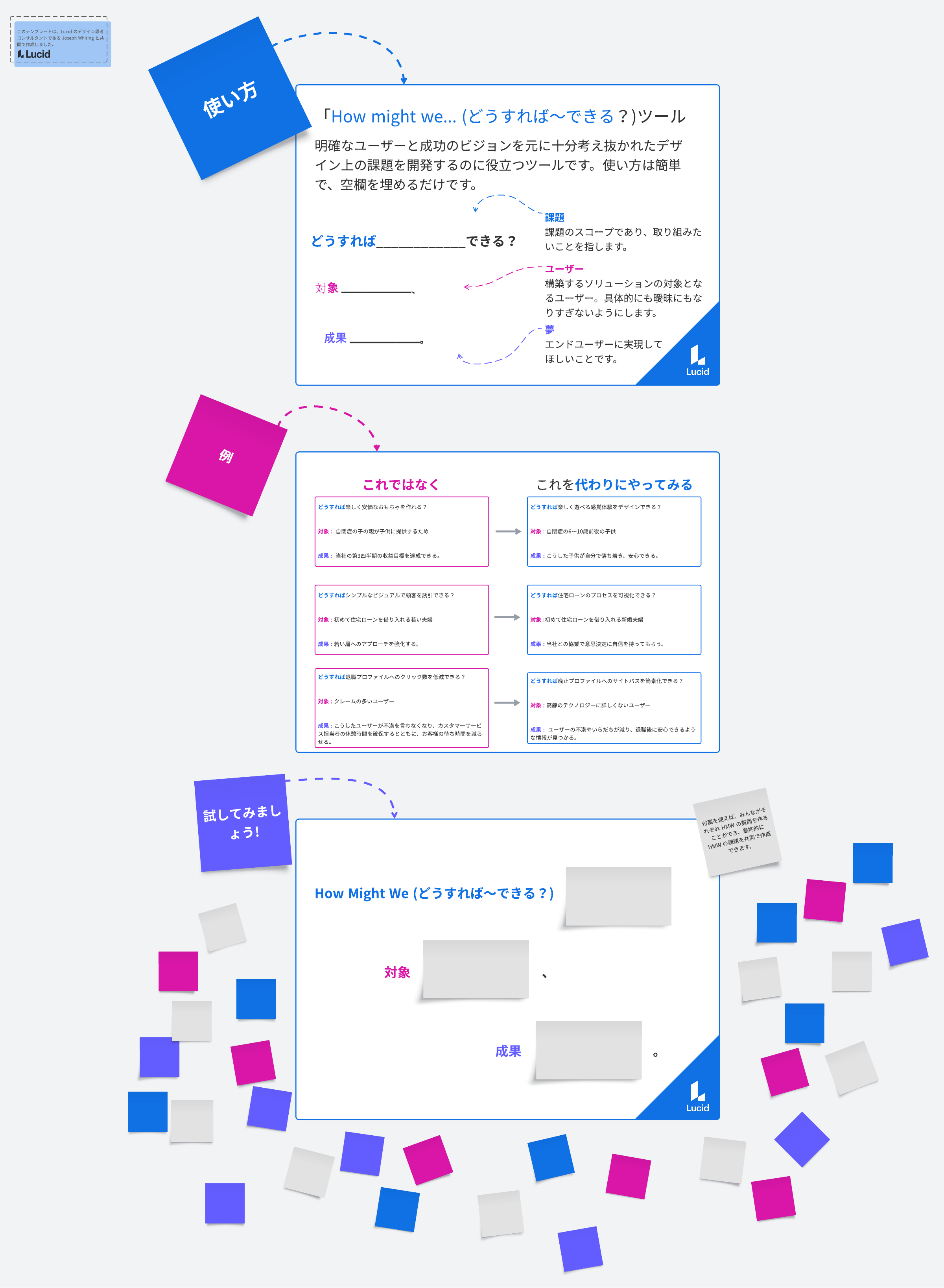 「How Might We (HMW/どうすれば~できる?)」はデザイン思考の真骨頂ともいえるツールで、厳密かつ有意義なデザインの課題を見極める問いかけとして、通常「定義」フェーズの最後に実施されます。「アイデア出し」フェーズに移行する前のゲートキーピングとしても利用できます。