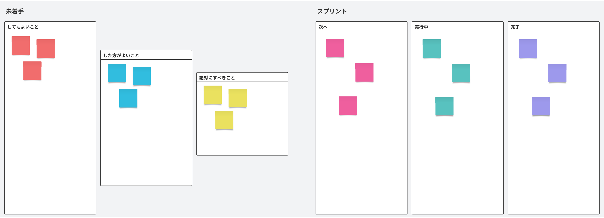スプリントミーティングでバックログアイテムに優先順位をつけ、テーマに沿った議論を進めるのに役立つアイデアファネルです。