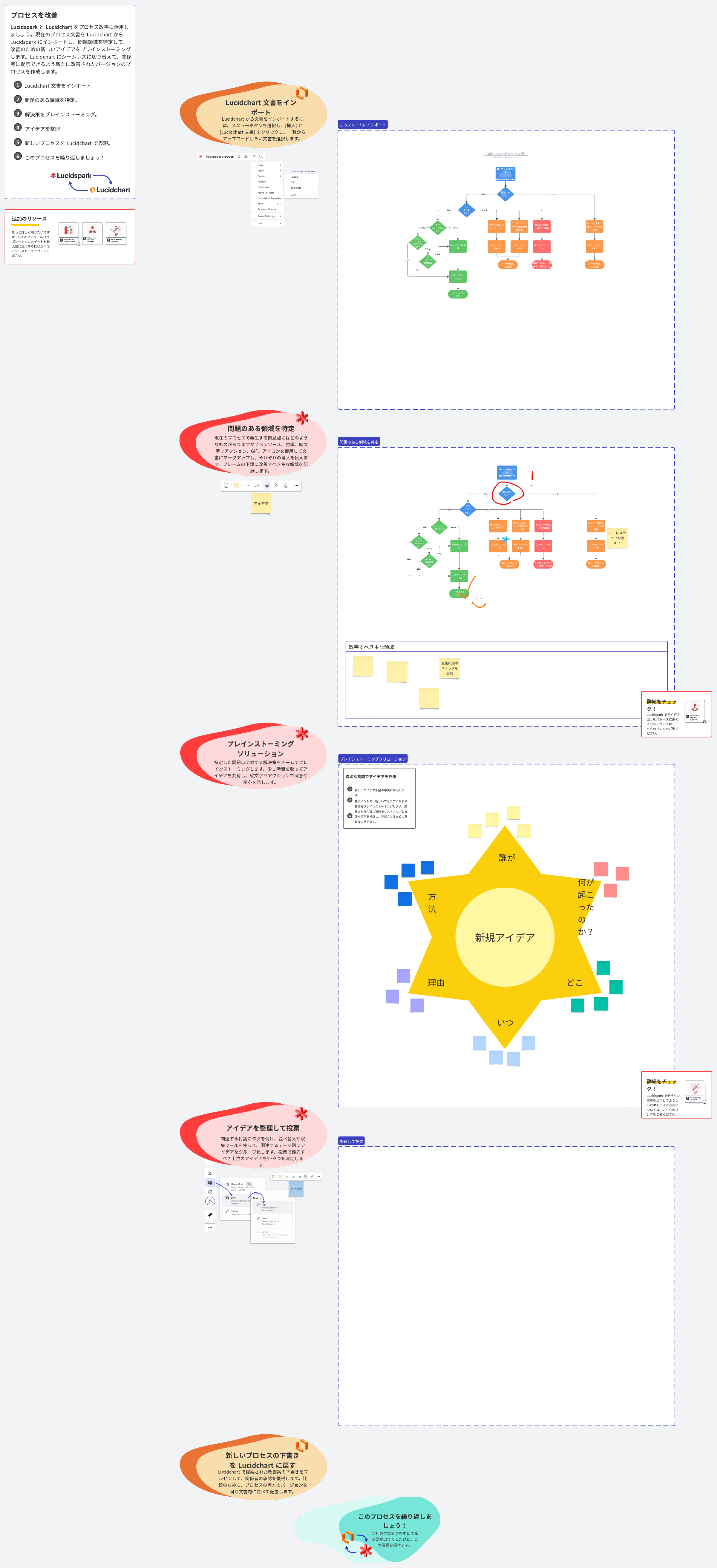 Lucid スイート (Lucidspark および Lucidchart) を使用して、既存のプロセスを改善します。まず、Lucidchart から作成した現在のプロセスフローをインポートします。次に、問題の領域を特定し、Lucidspark で改善のためのアイデアをブレインストーミングします。Lucidchart にシームレスに切り替えて、関係者に提示できるよう新たに改善されたバージョンのプロセスを作成します。