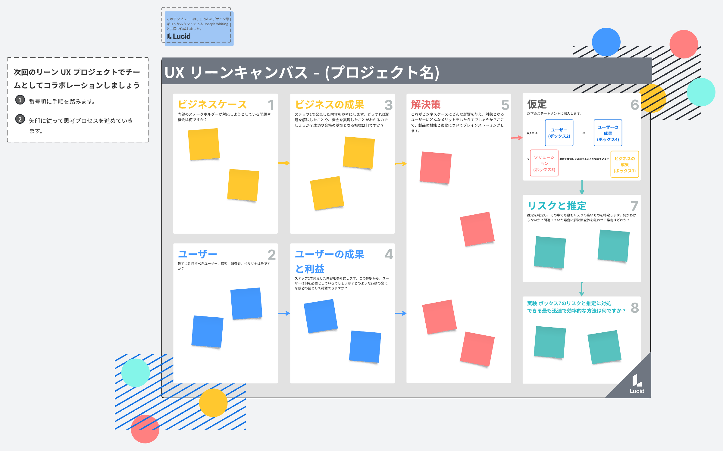 このテンプレートを使ってリーン UX プロジェクトでコラボレーションとスコープ設定を行いましょう。数字をたどり、矢印を使って1つの領域から付箋を引き出し、以降のプロセスのステップ立案に役立てます。