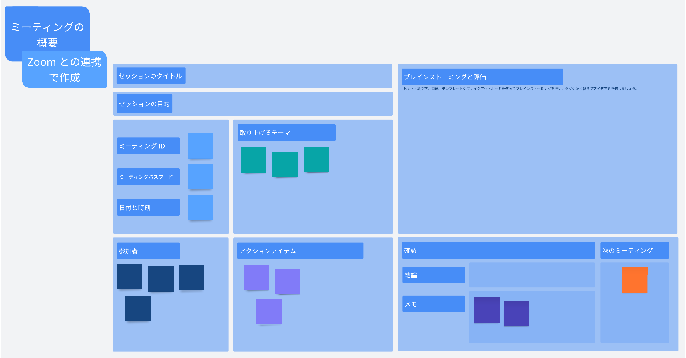 Zoom との連携で作成されたこのテンプレートをミーティングの計画や実施に役立てましょう。