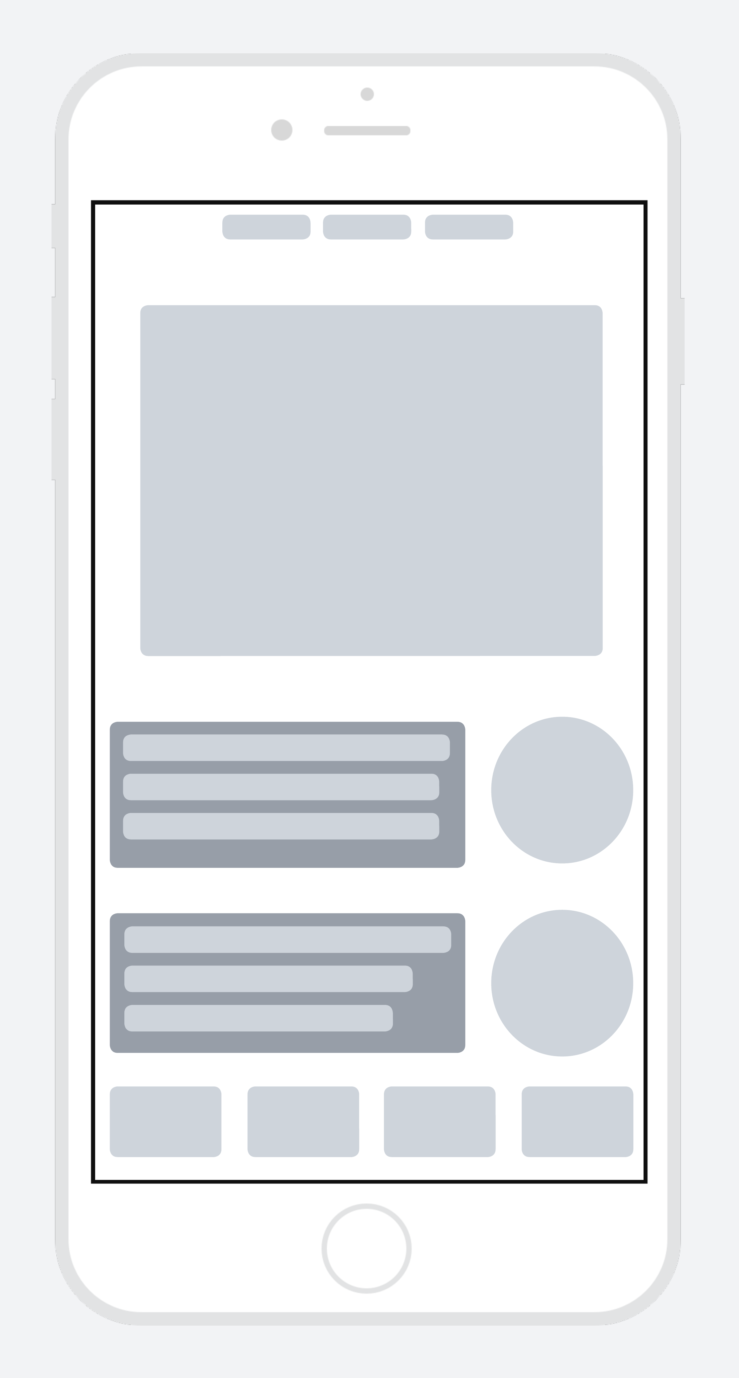 スマホワイヤーフレームとは、スマートフォン向けアプリやWebサイトの画面設計を視覚的に表現した設計図のことです。主にレイアウトや機能の配置(ボタン・メニュー・画像・テキストなど)をシンプルな線や図形で表し、デザインや開発の前段階で画面構成を検討・共有するために使われます。