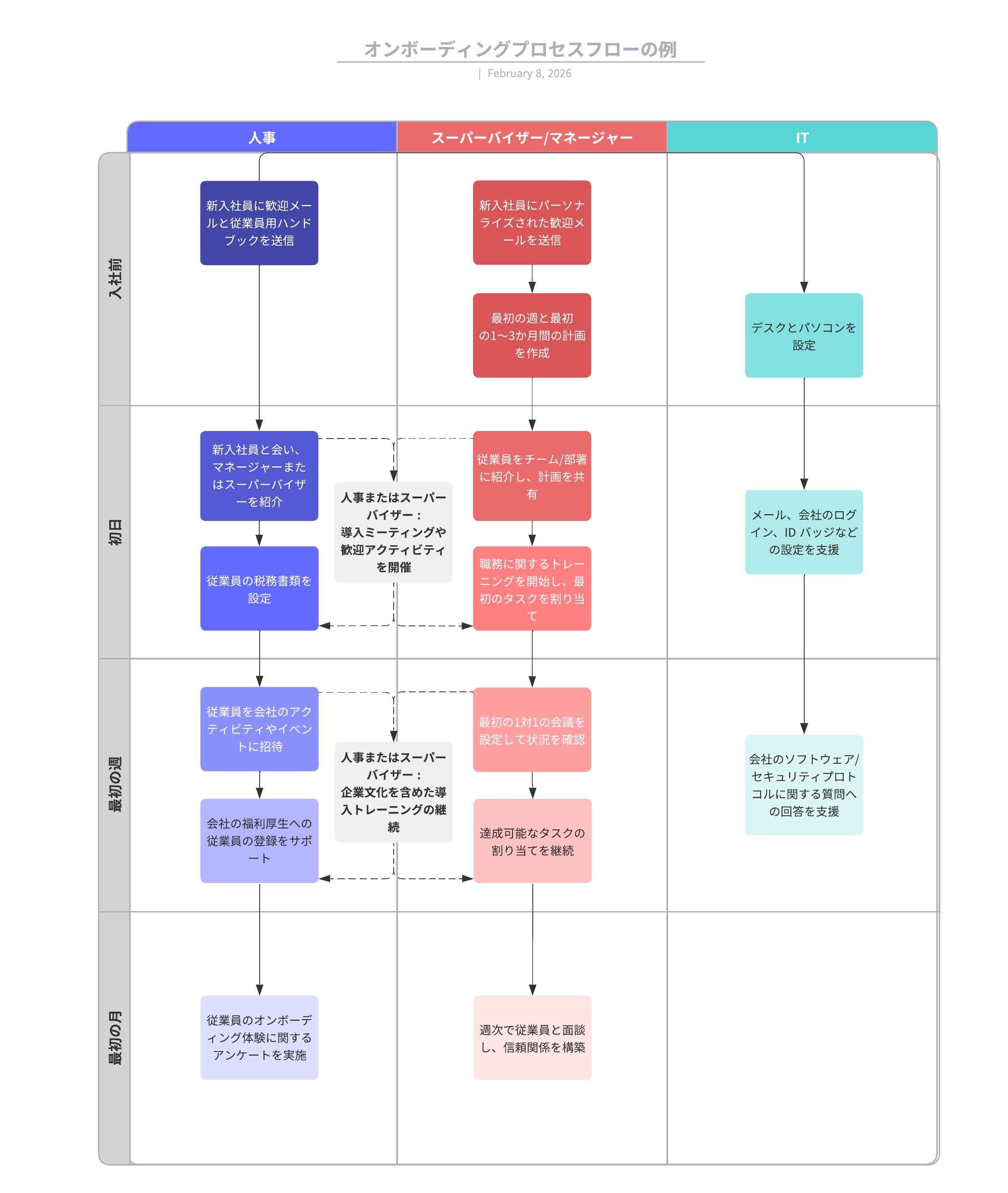 このオンボーディングプロセスフローのテンプレートは以下のような用途に役立ちます。