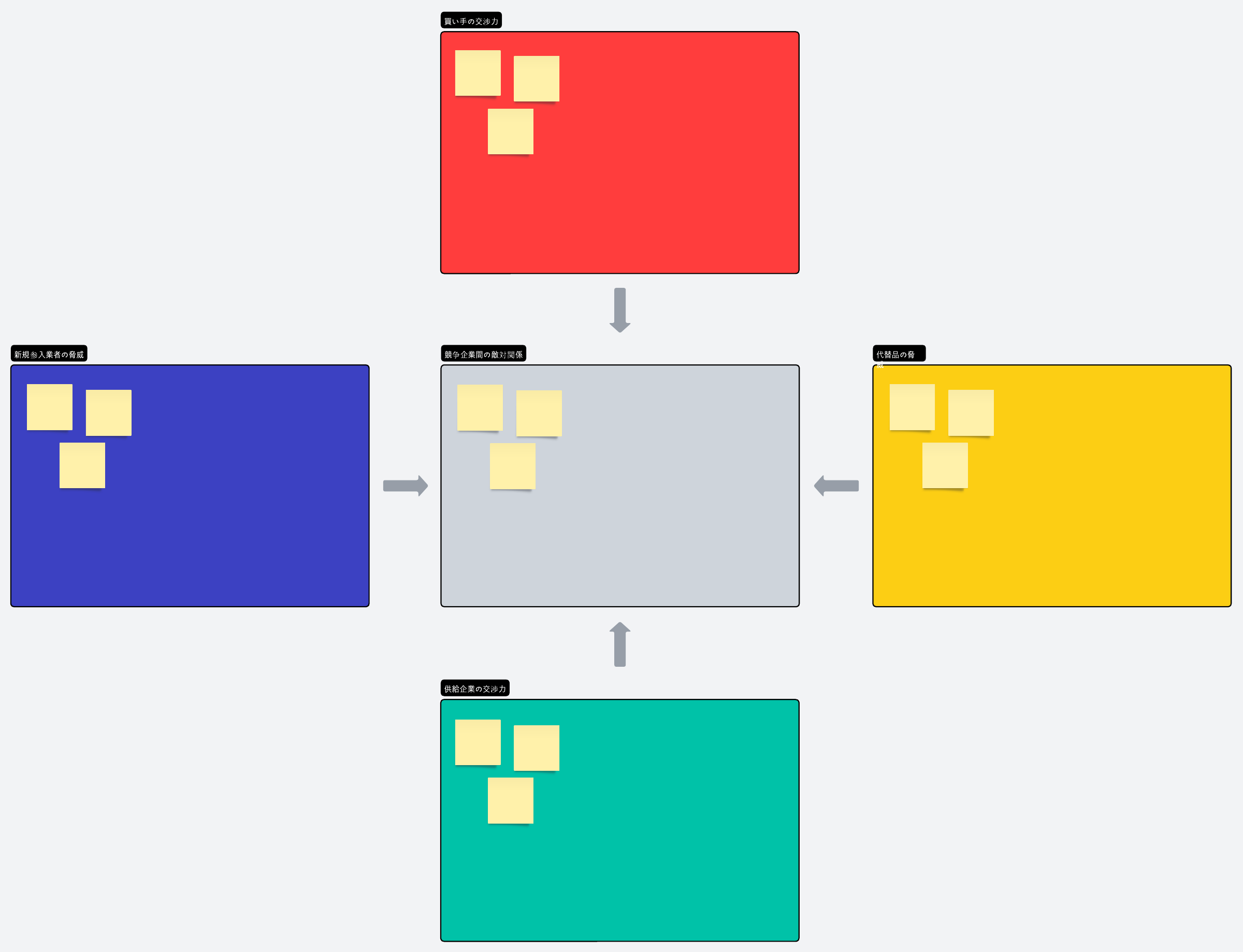 競争はビジネス界で避けられない要素です。自社が成功するためには、競合他社を正確に評価し、競合他社をしのぐための戦略を考え出す必要があります。ファイブフォース分析(5F)テンプレートを使用して、経営陣との共同評価セッションの指針としましょう。成功するための効果的な戦略をブレインストーミングする出発点に最適です。