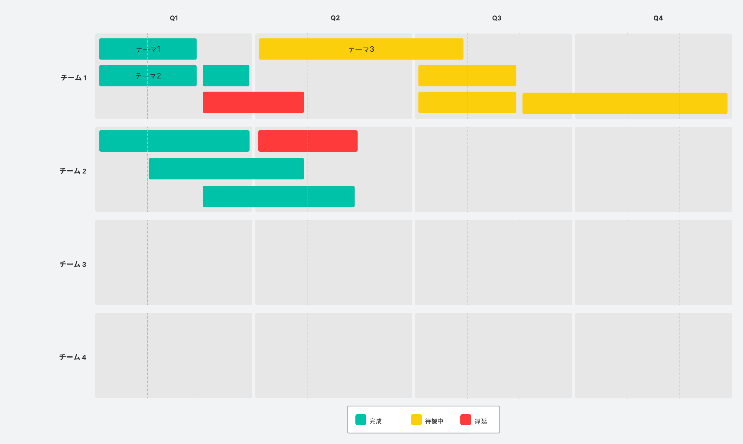 ロードマップの最初の内容に合意できたら、チームの進行状況を指示するツールとしてマップの使用を開始できます。プロジェクト開始時には、チームが本格的に作業を開始するまでの間、すべてのタスクバーを「待機中」の黄色にするのがよいでしょう。プロジェクトが進行する中でロードマップを随時確認し、指定の期限が過ぎるごとに、関連タスクを「完了」を示す緑や「遅延」を示す赤に変更します。