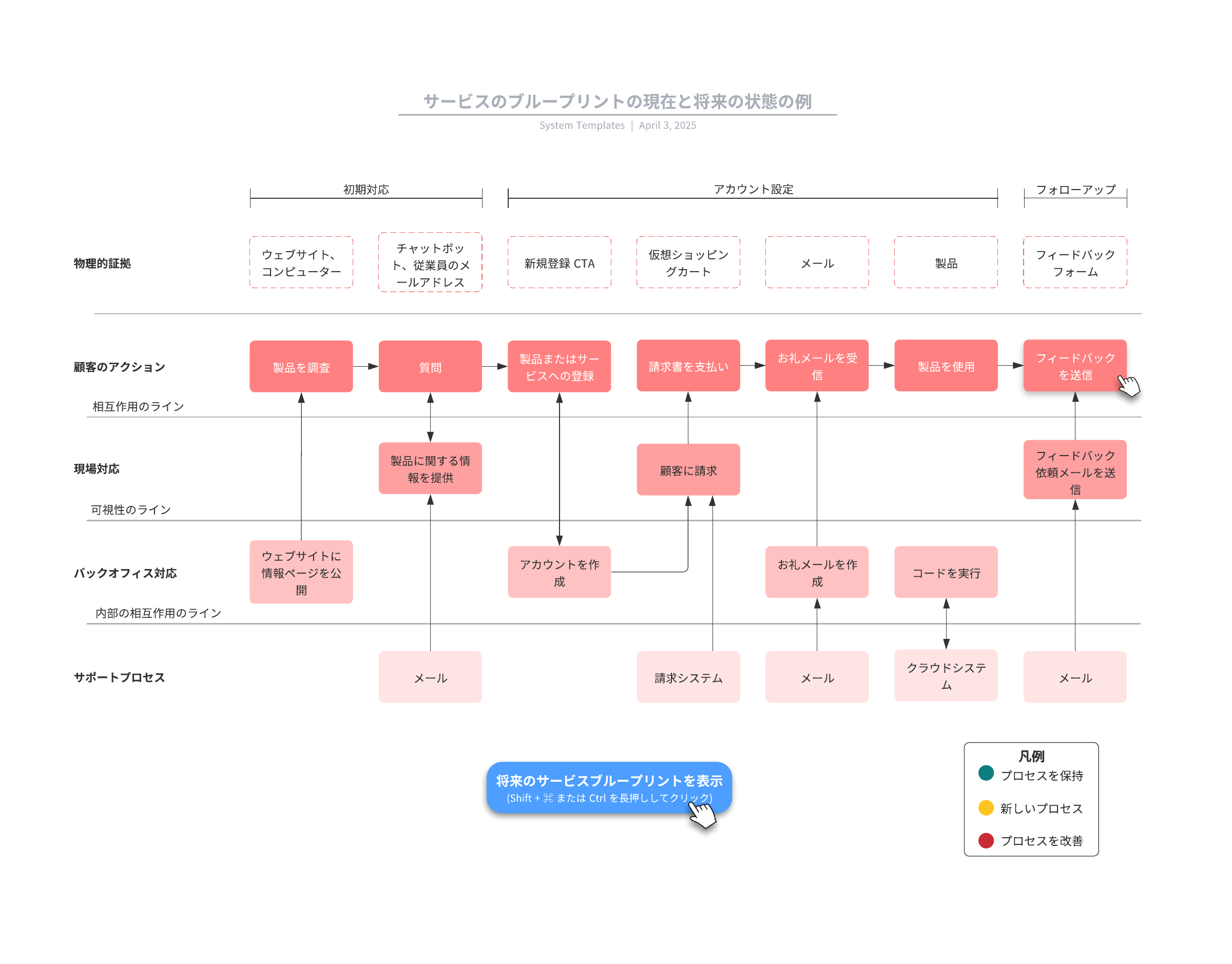 サービスブループリントの現在と将来の状態の例