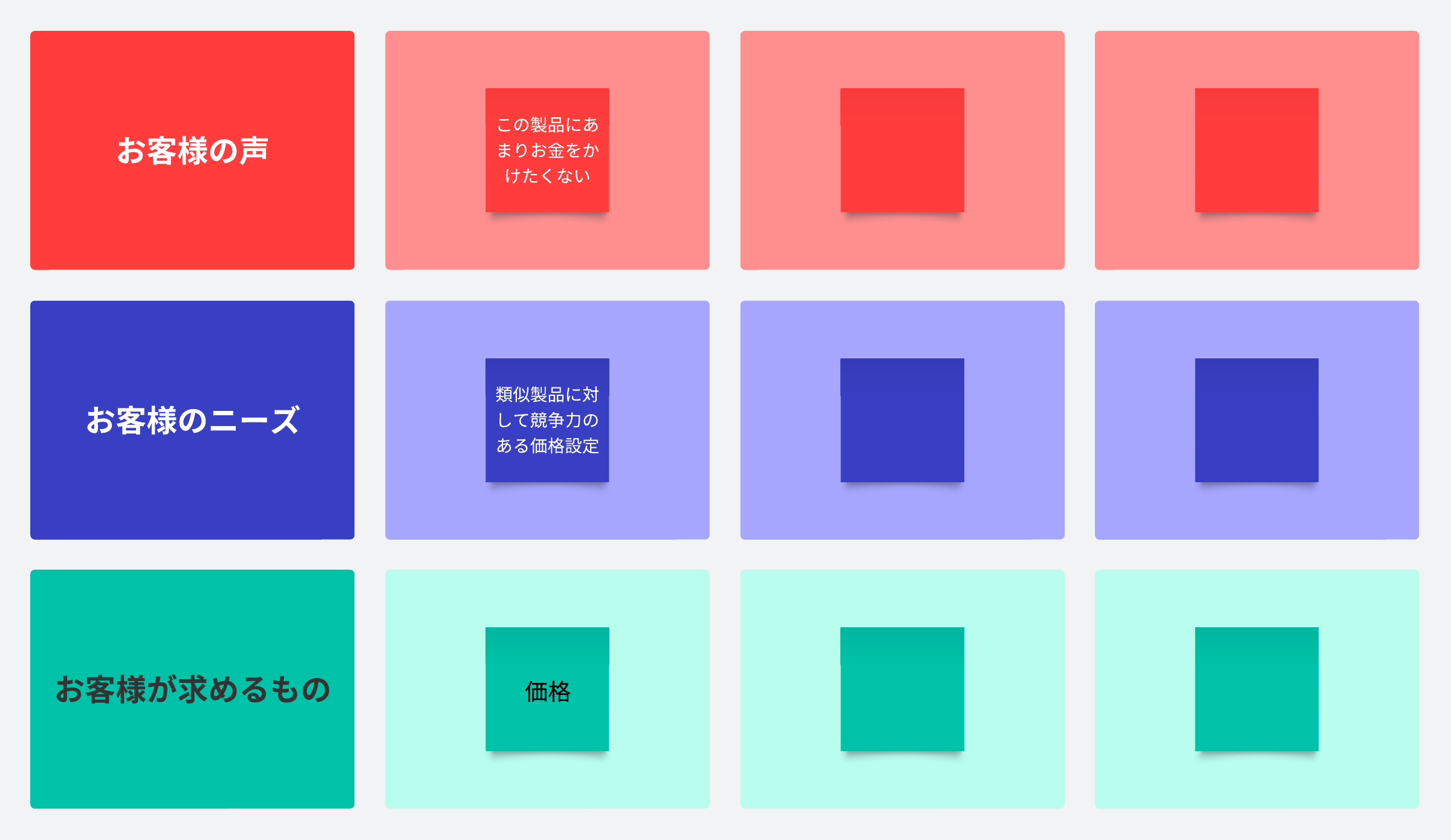 お客様の声マトリクスは、顧客が製品やサービスに何を求め、期待しているかを整理して表で表すのに役立ちます。