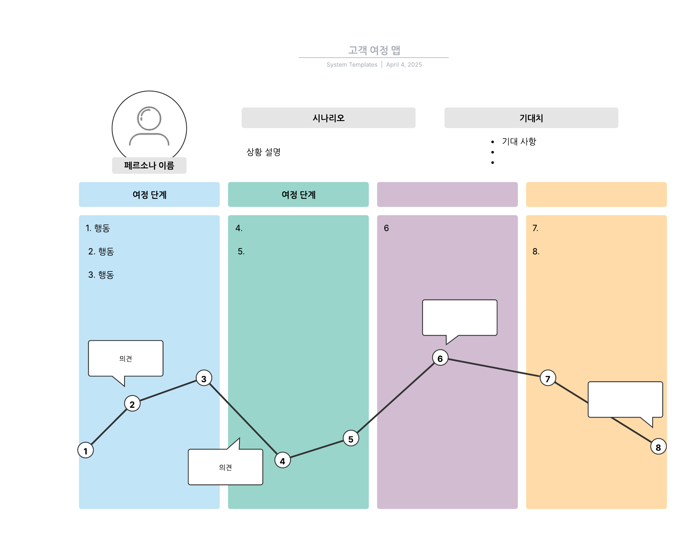 - 제품 또는 서비스 이용 과정에서 고객이 겪는 여정을 시각화합니다.