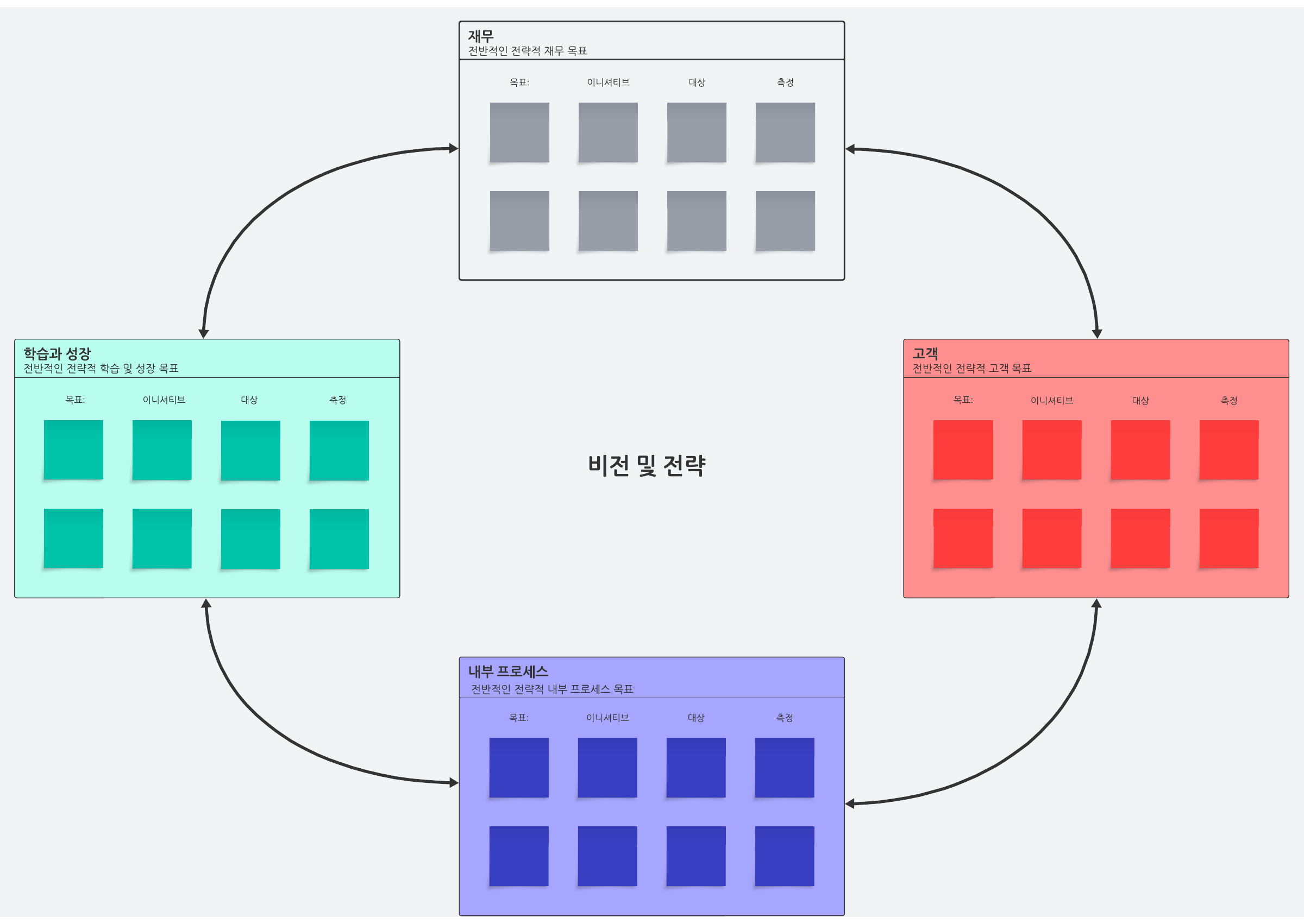 균형 성과표를 사용하여 전략적 목표를 정의하고, 조직에 대한 전반적인 비전을 개발하고, 목표를 측정 가능한 작은 이니셔티브로 세분화하십시오. 이 성과표는 고객, 재무, 내부 비즈니스 프로세스, 학습 및 성장이라는 네 가지 주요 비즈니스 측면에 중점을 둡니다.