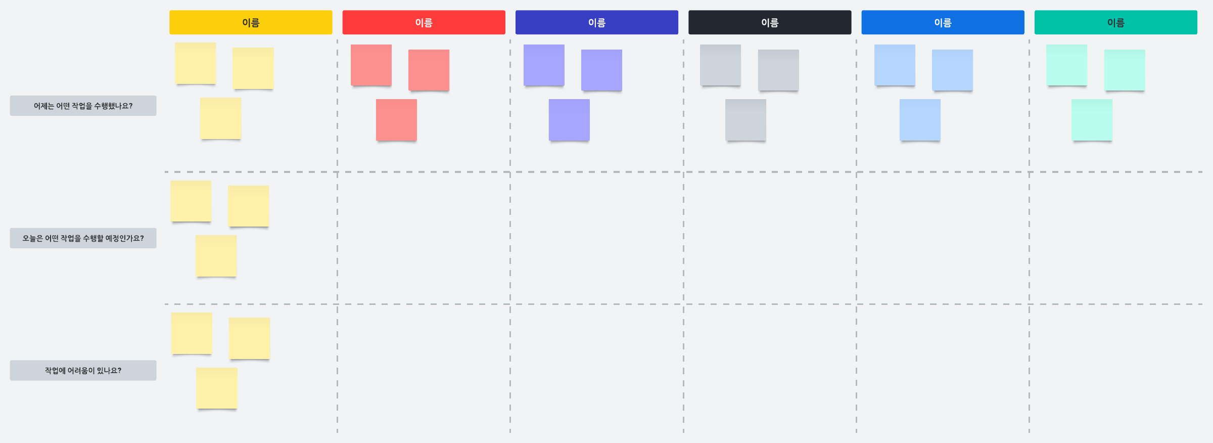 이 일일 스탠드업 보드를 사용하여 팀원들의 이해를 일치시키세요. 스탠드업 회의는 팀원들이 각자 어떤 작업을 수행하고 있는지 알 수 있도록 돕고 방해 요소를 해결할 수 있는 기회를 제공합니다.