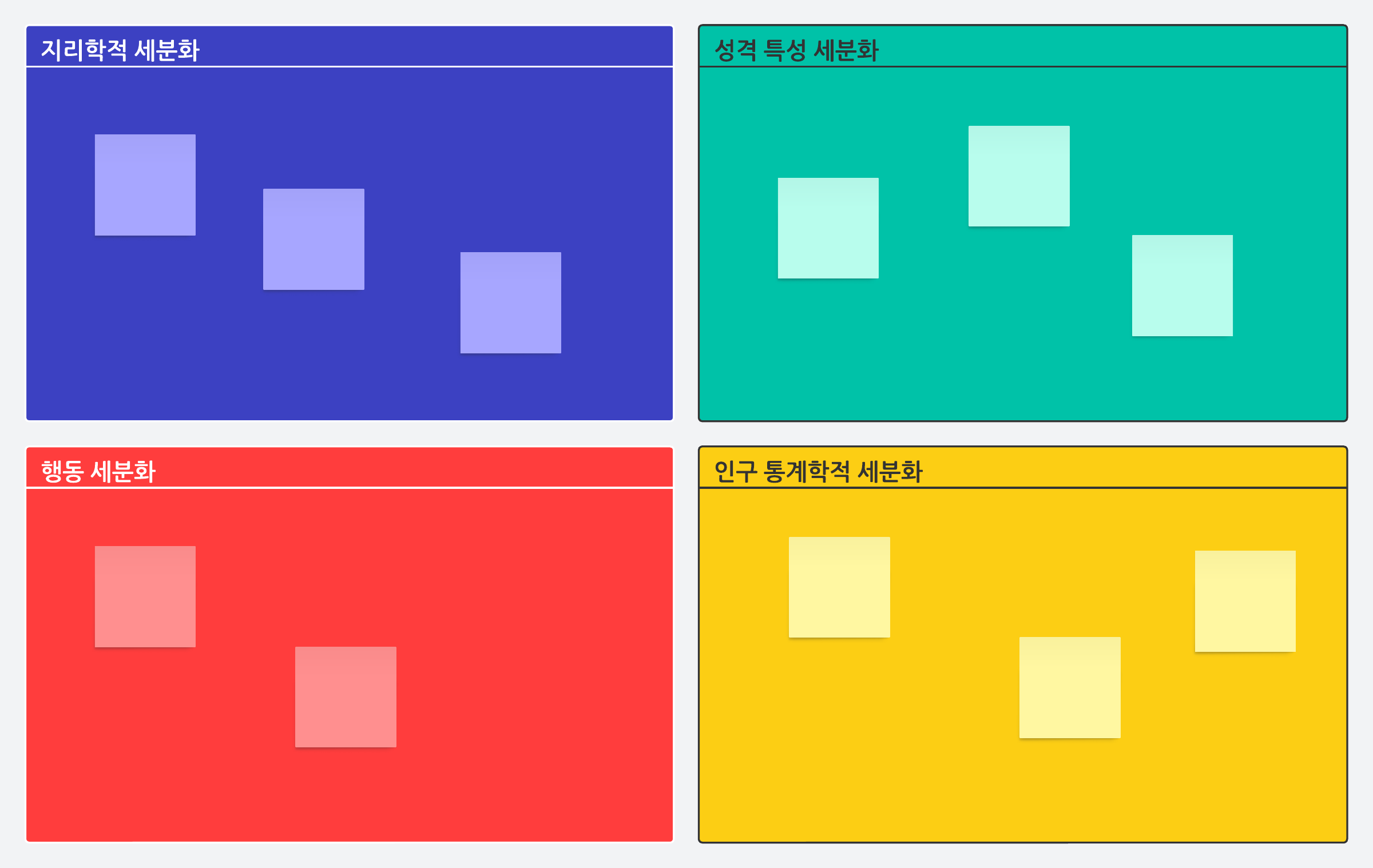 대상 시장을 더 정확하게 이해하고, 시장을 지리학적 하위 세트, 성격 특성 하위 세트, 행동 하위 세트와 인구 통계학적 하위 세트로 나누어 더 나은 제품 마케팅 경험을 제공하세요.