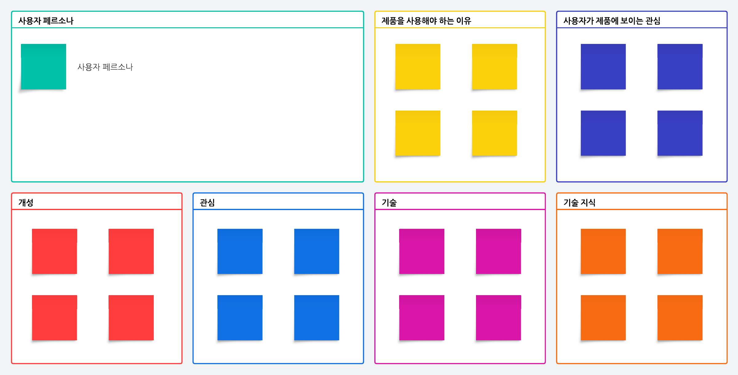 사용자 페르소나를 생성하여 대상 그룹의 흥미를 유발할 수 있는 요소를 살펴보십시오. 이 템플릿에 관련 세부 정보와 사용자 정보를 추가하고 팀원들에게 공유하여 모두의 견해를 통일하십시오.