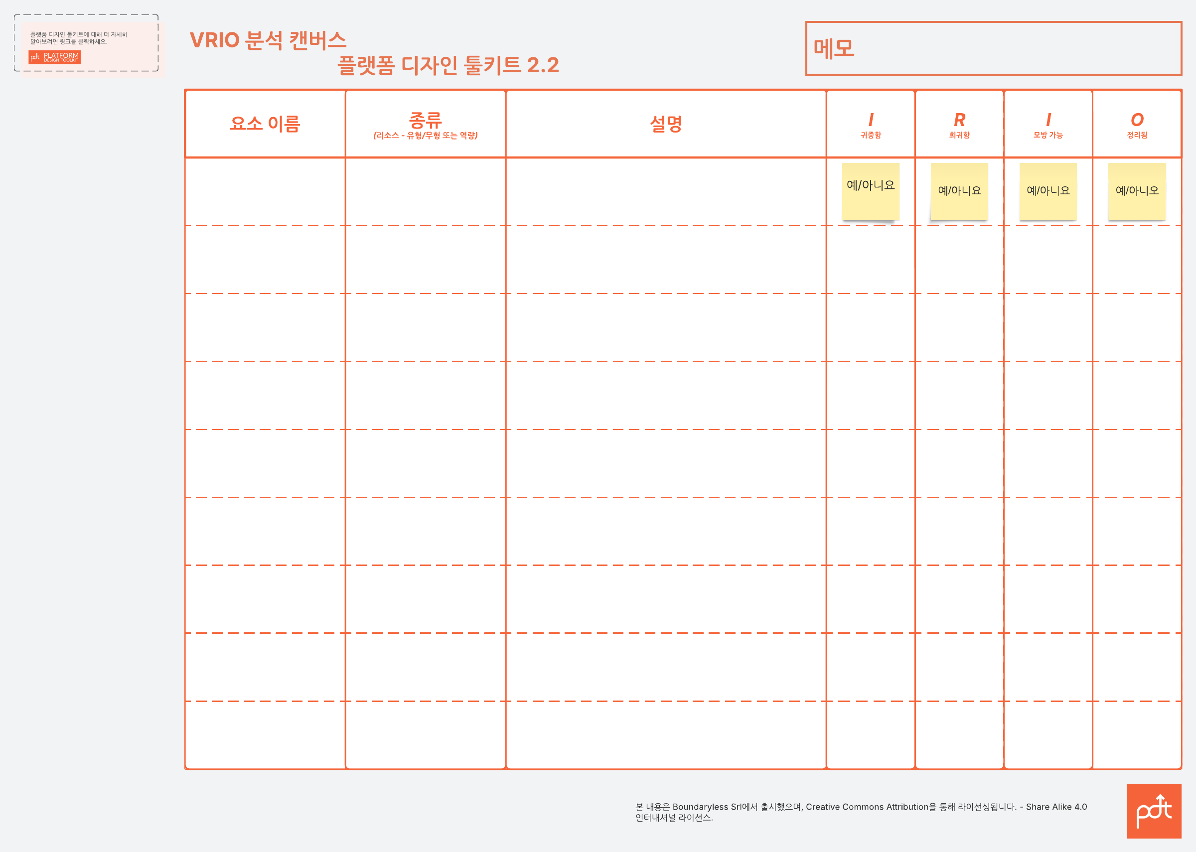 VRIO를 활용해 조직의 기존 애셋/이점을 매핑하세요(분류: 귀중함, 희귀함, 모방 가능성, 정리됨).