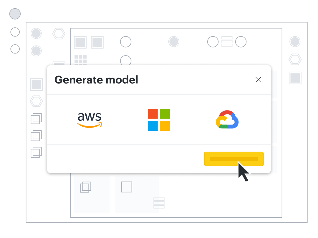 Auto-generate a model from your imported data in the Lucid documents menu by selecting +New and hovering over Lucidscale to select either AWS, Azure, or Google Cloud. Choose your data source and follow the prompts to create your model.