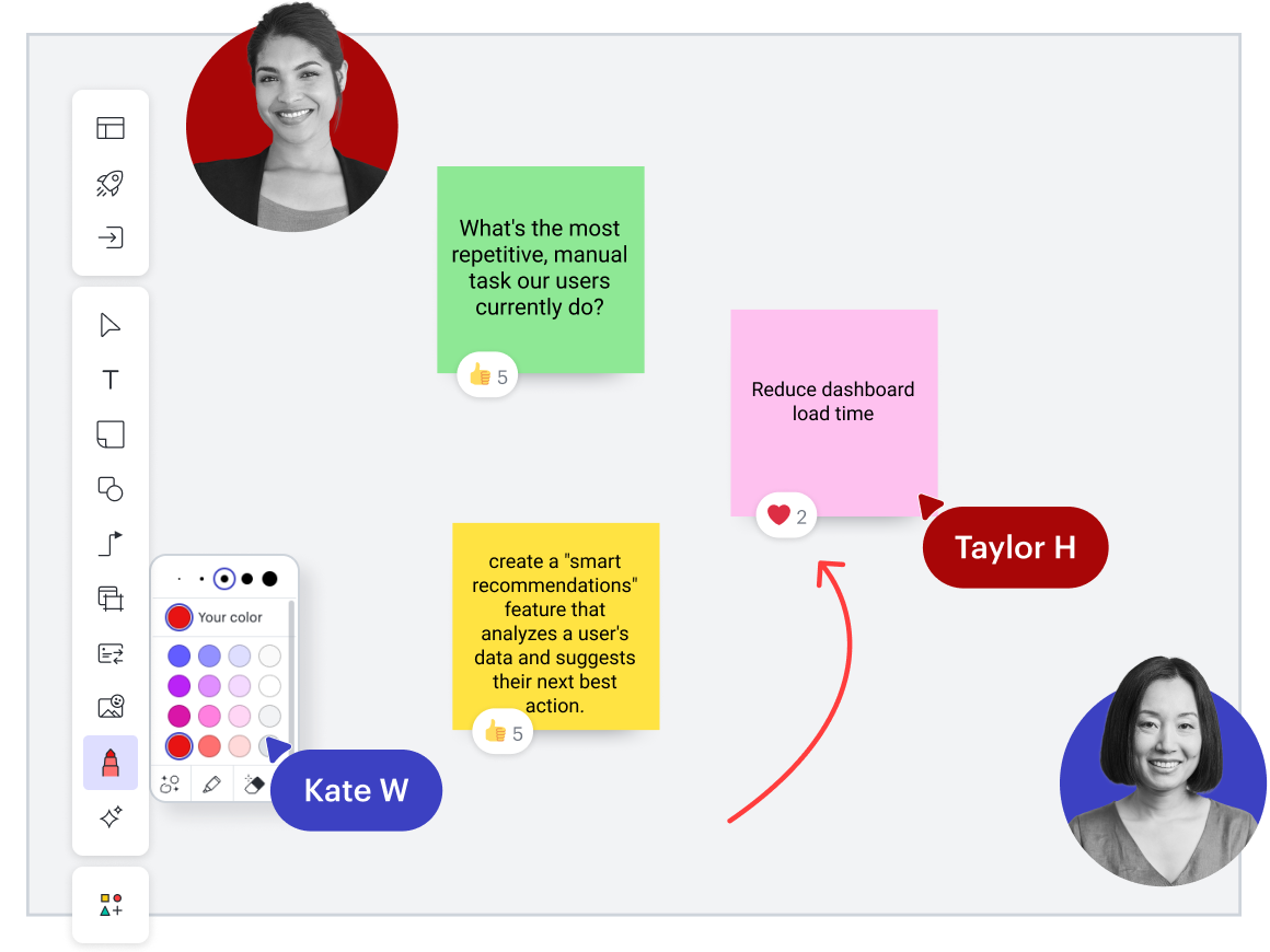 Bring your team together on an infinite canvas to visualize, organize, and share ideas. Add sticky notes, freehand drawing, images, and content organizers. Easily drag and drop shapes and lines, and customize text and colors.