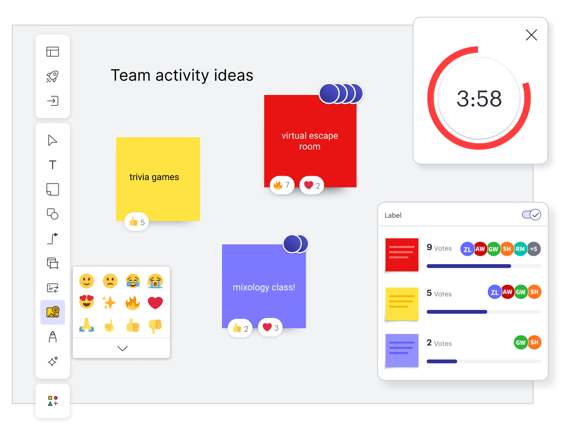 Facilitate engaging meetings and team events with breakout boards, the laser pointer, timed voting sessions, and more. Comment, chat, and add emoji reactions within your board to give feedback and strengthen team connections.