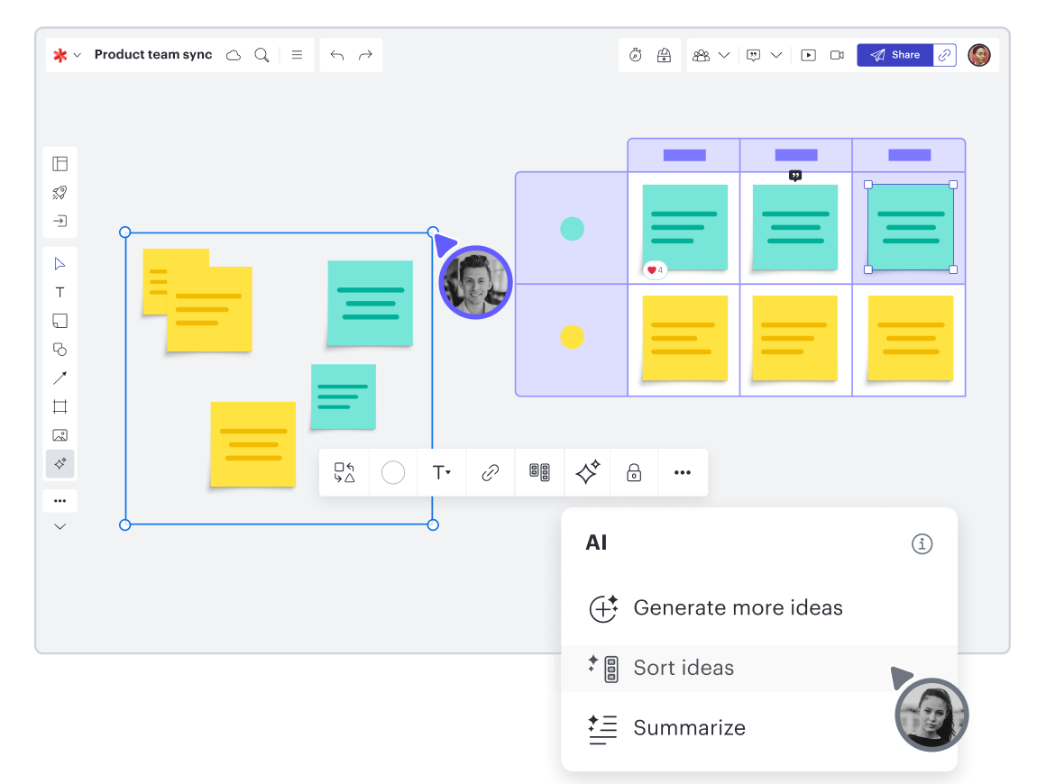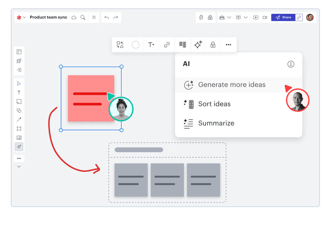 Go a step further by uncovering key themes with AI. Click to sort ideas, and your sticky notes will be grouped into categories within Containers. That’s where you’ll start to see the big picture.