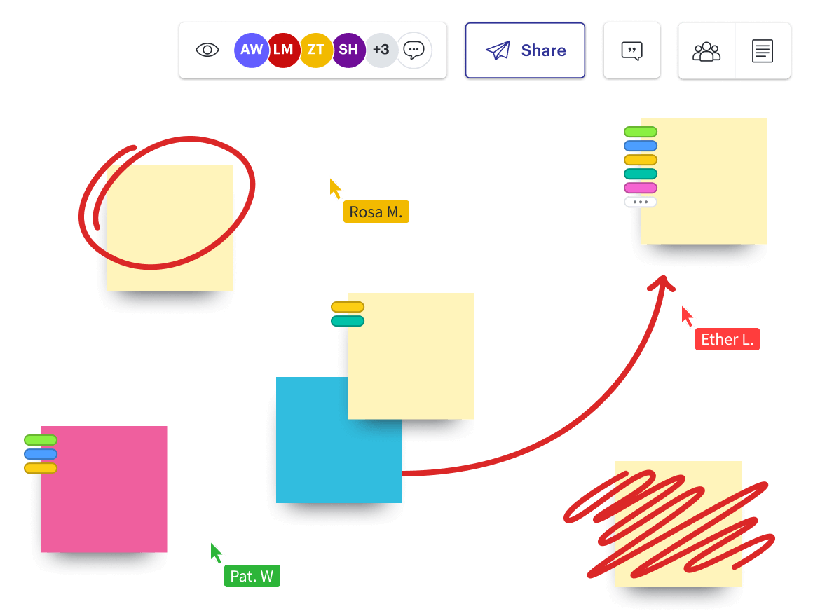 Een virtuele vergaderruimte met alles wat je nodig hebt om te spelen met ideeën, voort te bouwen op elkaars creativiteit en nuttige feedback te delen. Werk vlot door met een ingebouwde timer, een stemfunctie, handige sjablonen en tekengereedschap. Perfect voor teams op afstand.