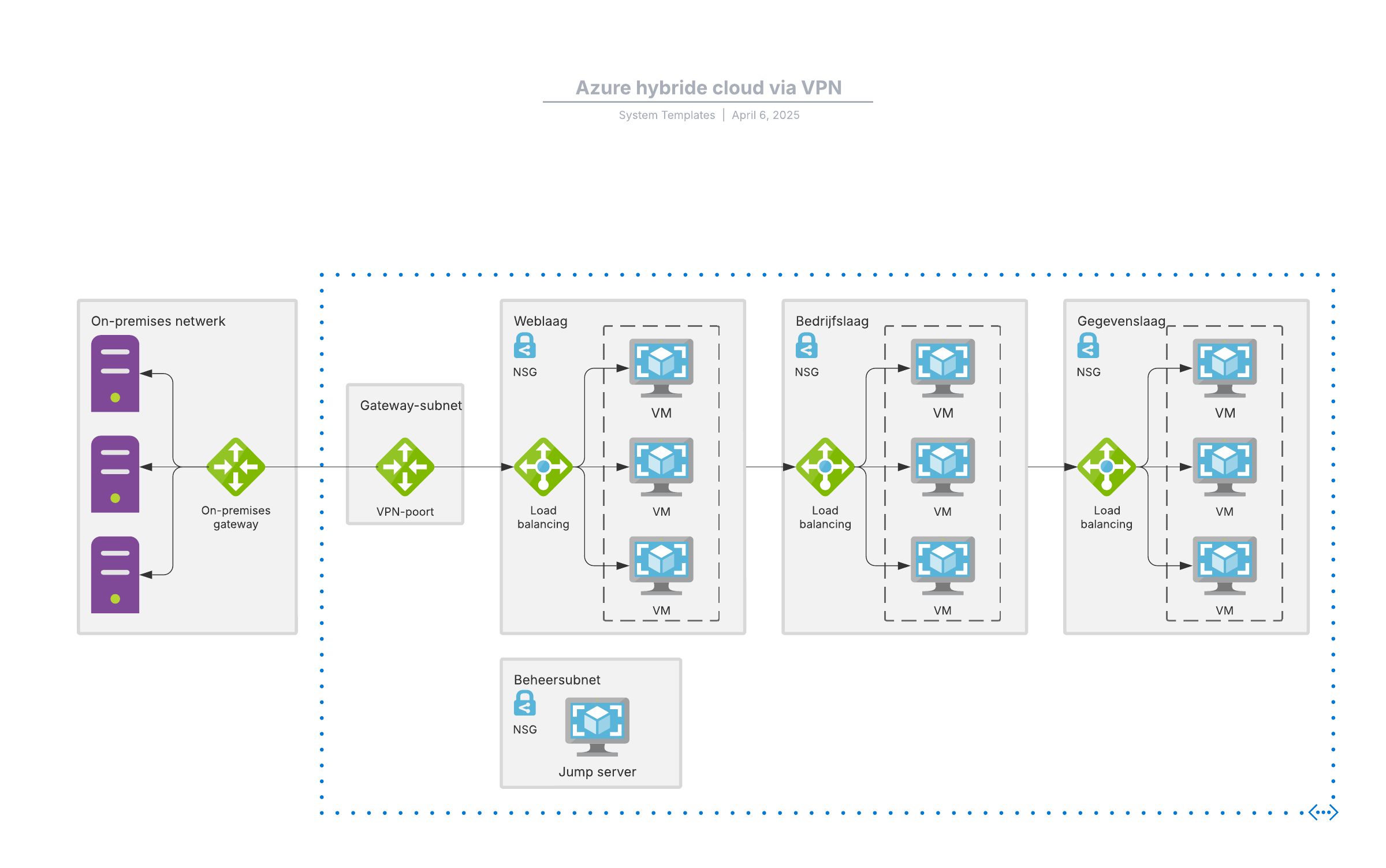 Open deze sjabloon voor een referentiearchitectuur voor een Azure hybride cloud via VPN die u kunt aanpassen op uw use case