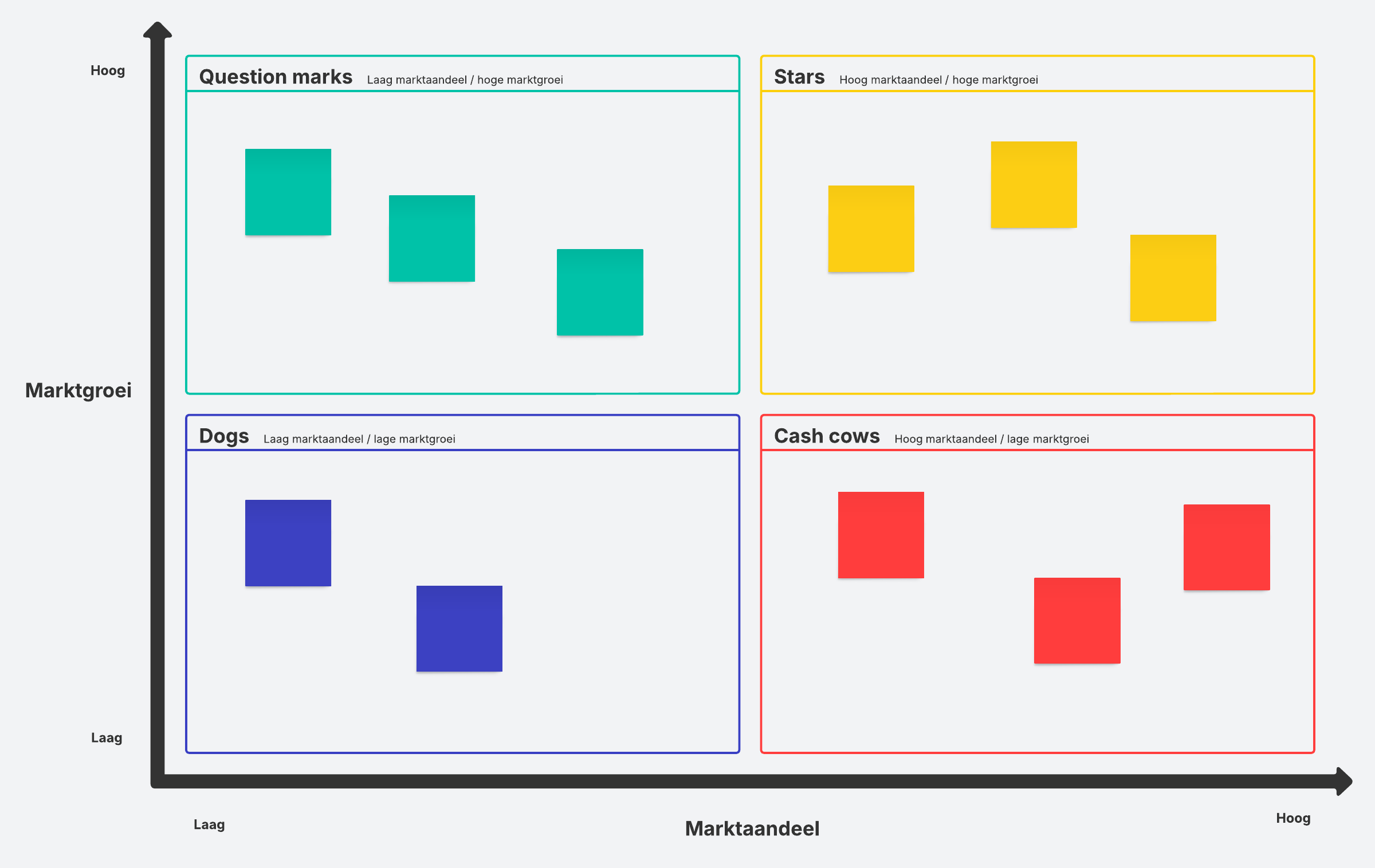 Gebruik deze matrix voor marktgroei om te bepalen welke prioriteit u moet geven aan uw verschillende producten. Wijs elk product toe aan een van de vier kwadranten, zodat u weet waaraan u tijd en geld moet besteden om de meeste waarde te genereren.