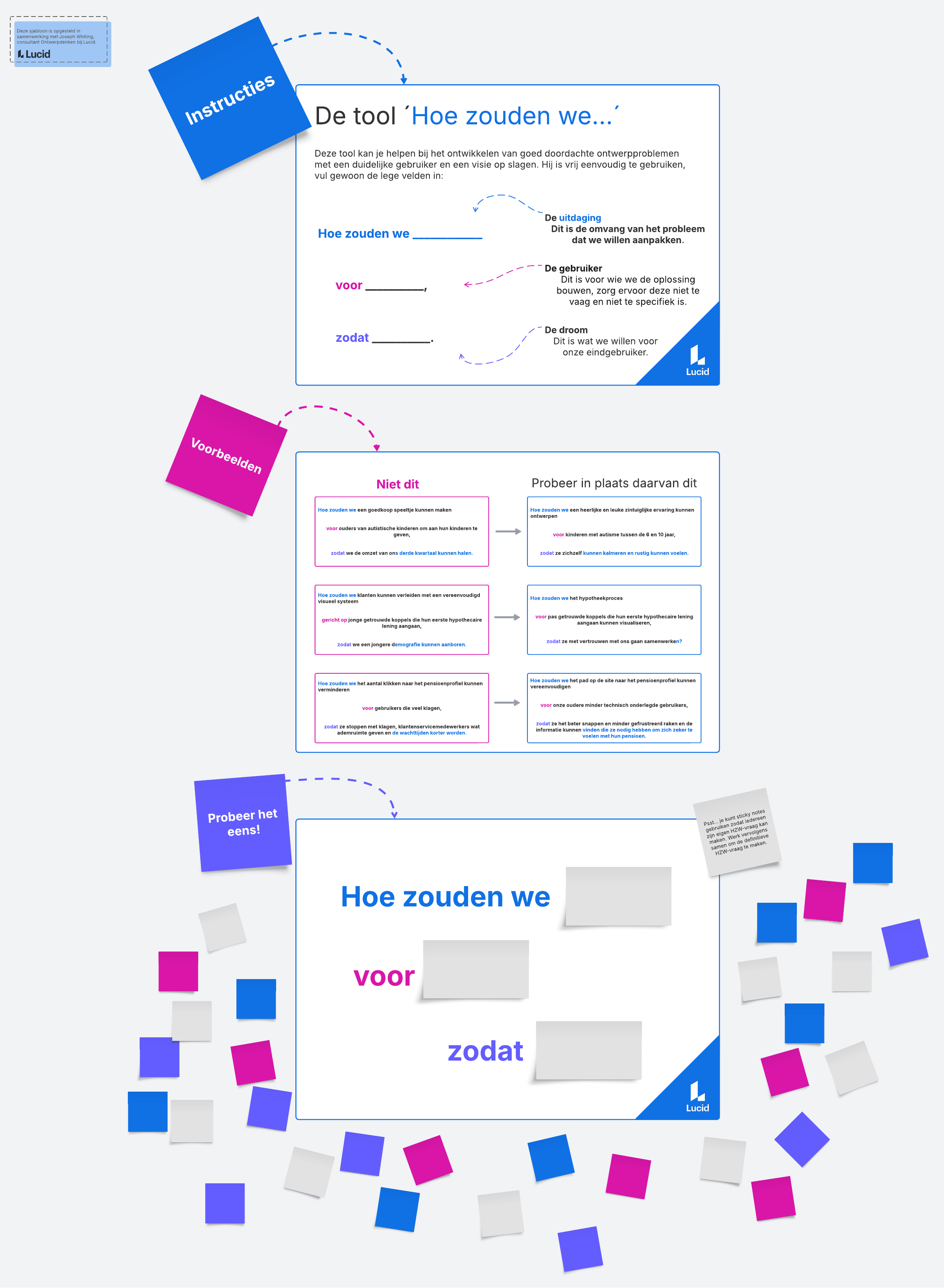 De "hoe zouden we"-vraag is een typische tool voor ontwerpdenken. Hij is bedoeld om grondige en zinvolle ontwerpprobleemvragen te vormen en wordt meestal toegepast aan het einde van de "definieer"-fase. Hij kan ook worden gebruikt als een poortwachter-item, voordat het team verdergaat naar de "ideevorming"-fase.