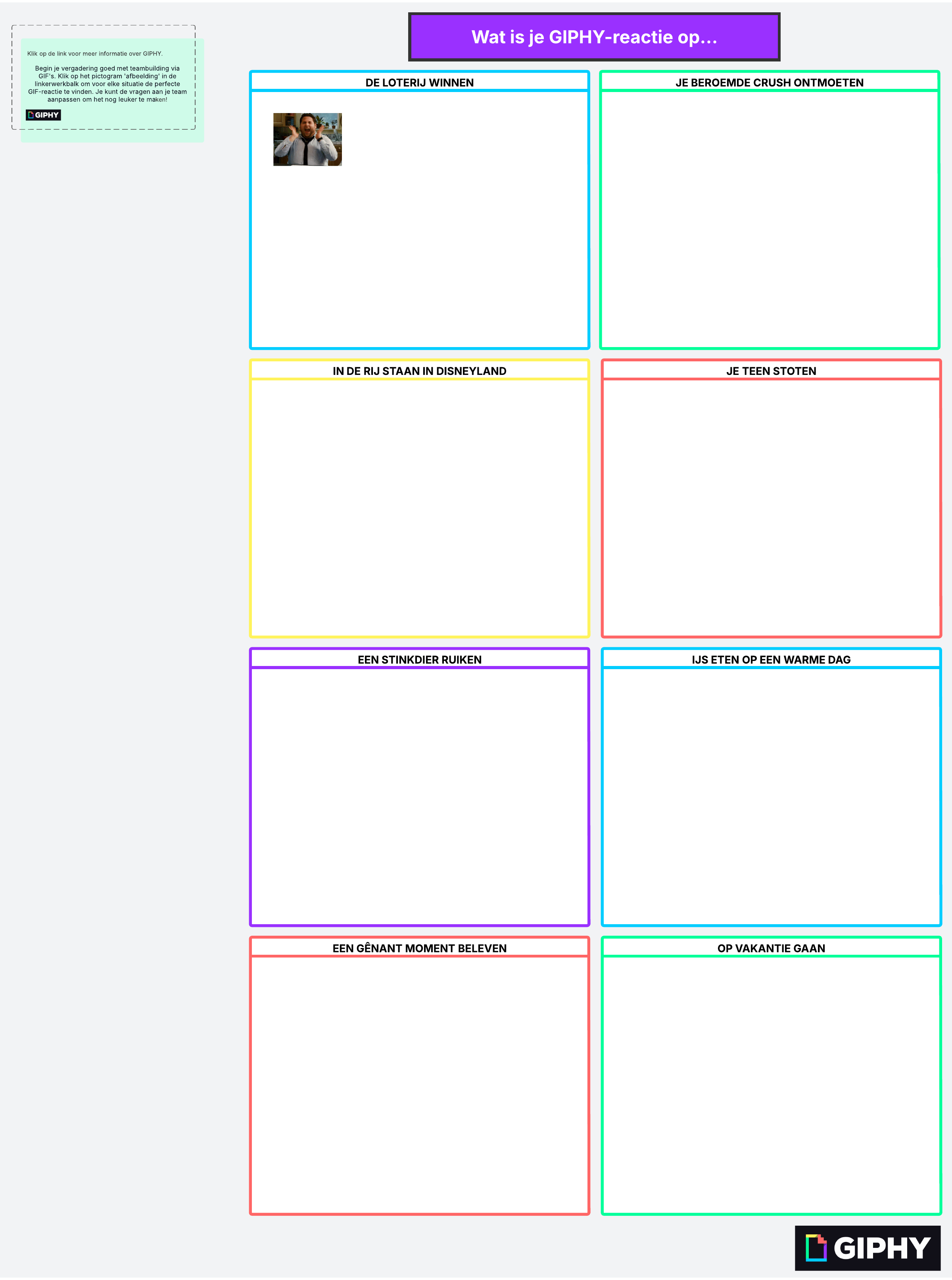Begin je vergadering goed met teambuilding via GIF's. Klik op het pictogram 'afbeelding' in de linkerwerkbalk om voor elke situatie de perfecte GIF-reactie te vinden. Je kunt de vragen aan je team aanpassen om het nog leuker te maken!