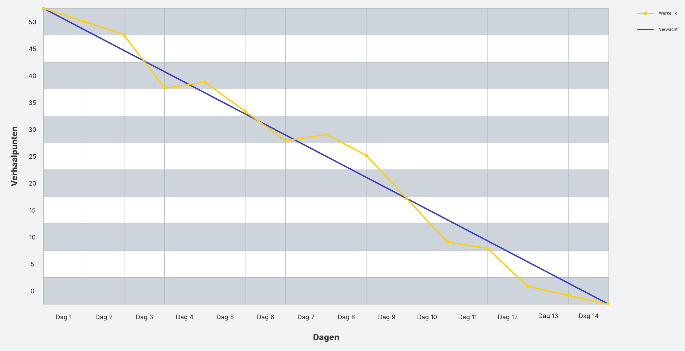 Gebruik dit burndowndiagram om de voortgang van je team tijdens een sprint bij te houden. Als je het samen met andere Agile-sjablonen gebruikt, kunt je zien hoeveel werk er verzet is, hoeveel werk er nog te doen is en hoeveel tijd er op een bepaald moment overblijft.