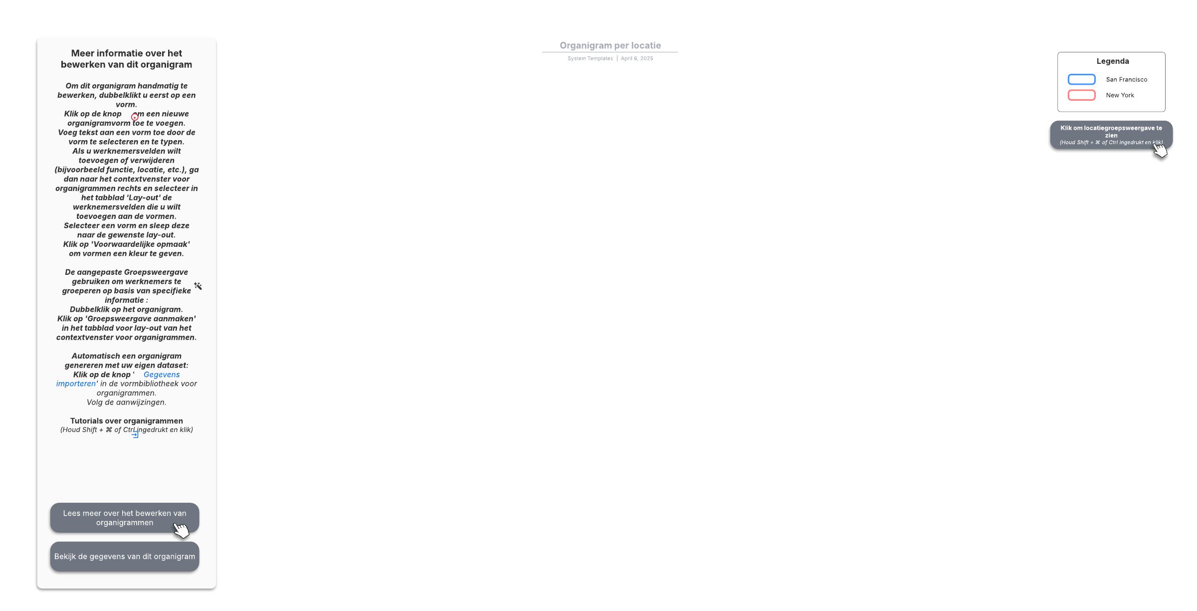 Open deze sjabloon voor een gedetailleerd voorbeeld van een organigram per locatie dat u kunt aanpassen aan uw eigen gebruiksvoorbeeld.