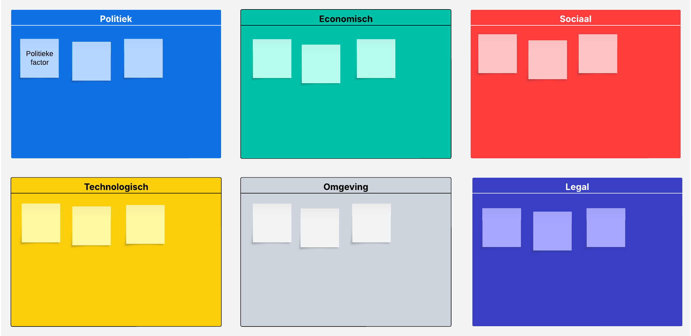 Begin met brainstormen over alle politieke factoren die van invloed zijn op je bedrijf. Denk aan zaken als belastingbeleid, regelgeving, tarieven, overheidsstabiliteit, overheidssubsidies, lobbywerk en handelscontrole. Elke bijdrage van de brainstorm moet als sticky note in hetzelfde vak worden geplaatst.