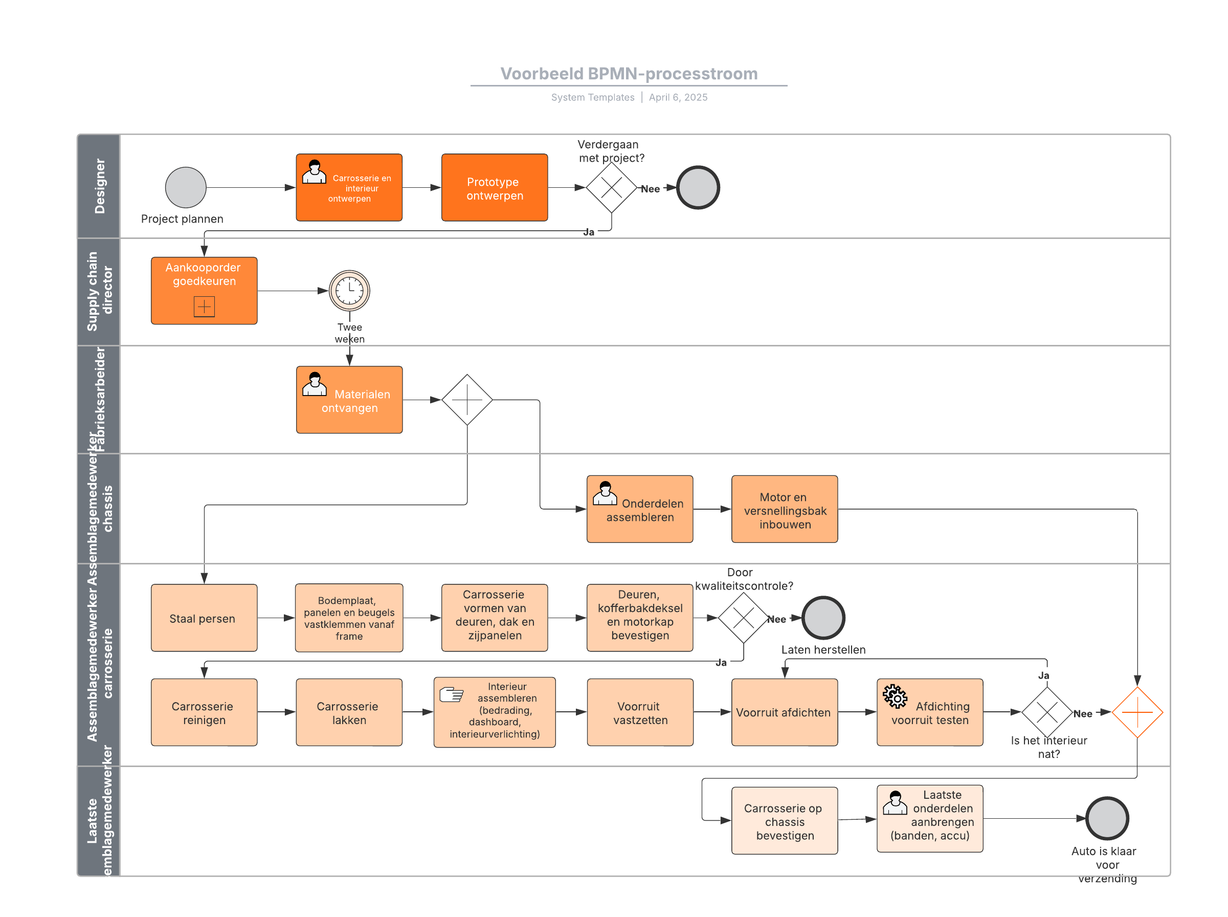 Open deze sjabloon voor een gedetailleerd voorbeeld van een BPMN-processtroomdiagram dat u kunt aanpassen op uw use case.