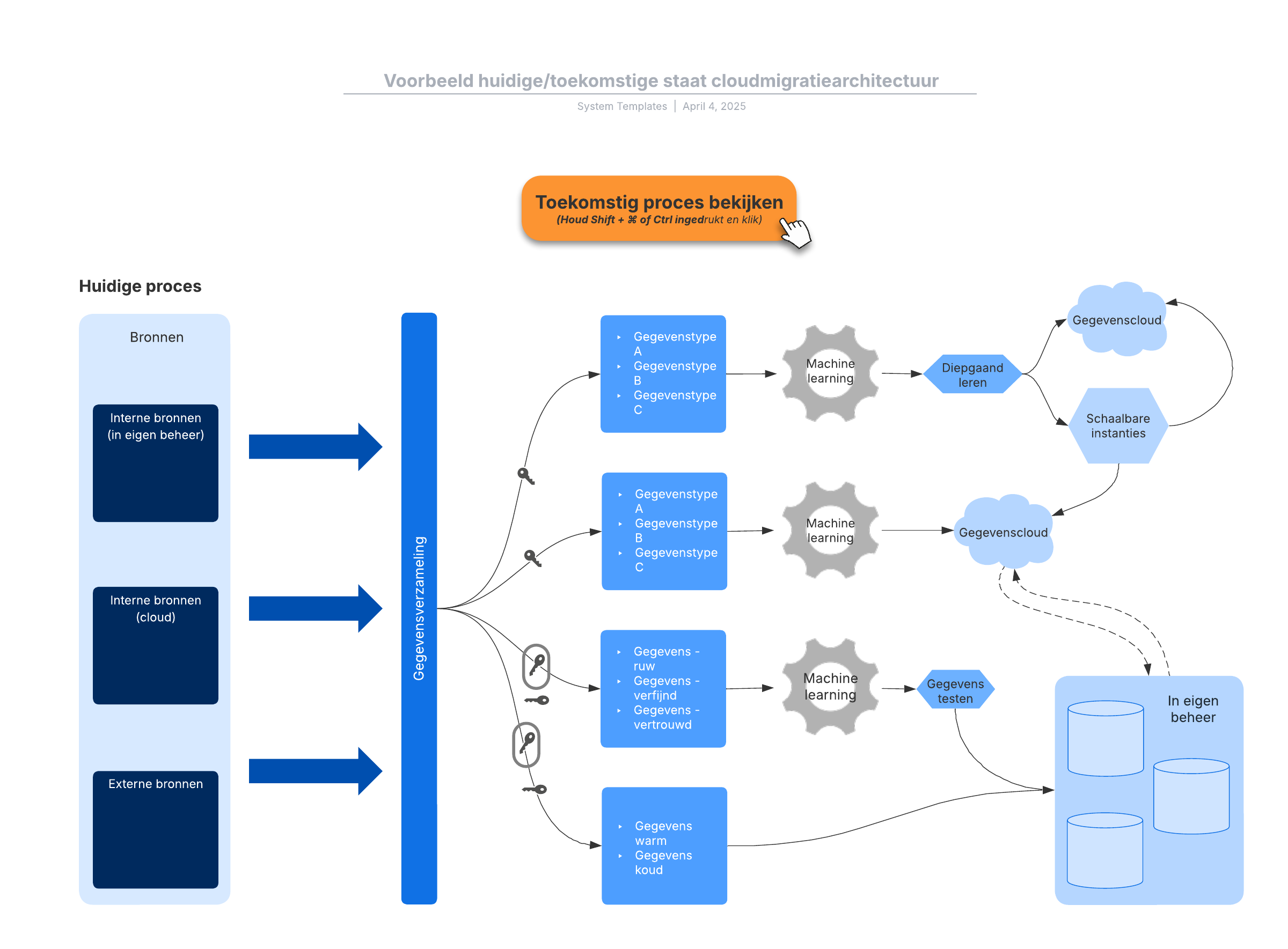 Open deze sjabloon en voeg inhoud toe om dit diagram van de huidige/toekomstige staat van een cloudmigratiearchitectuur aan je gebruikssituatie aan te passen.