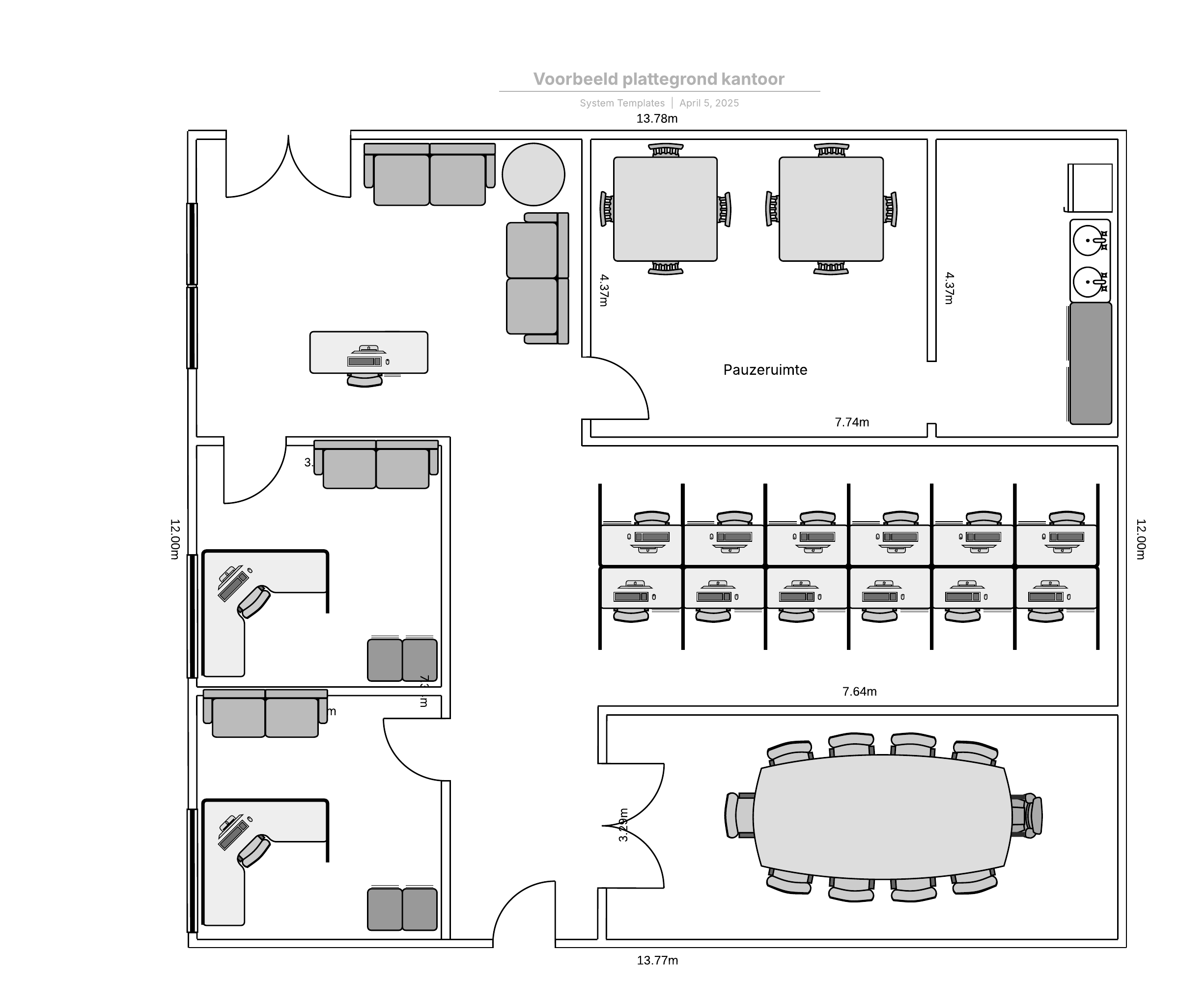 Open dit sjabloon voor een gedetailleerd voorbeeld van een kantoorplattegrond dat u kunt aanpassen op uw use case.