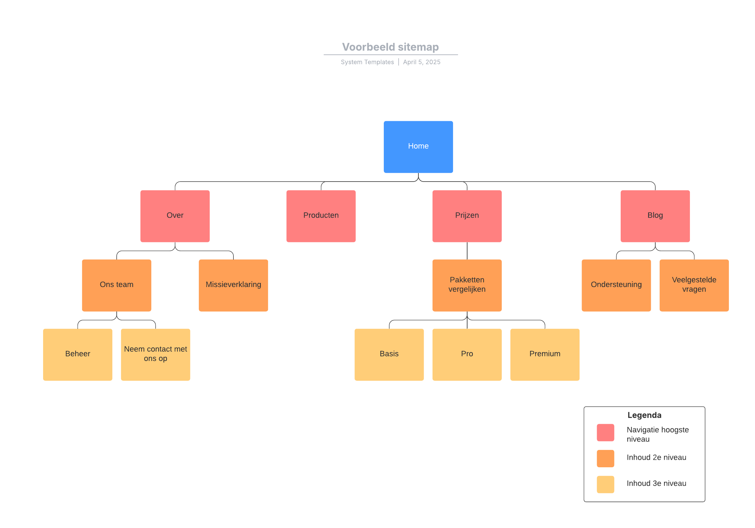 Open deze sjabloon voor een gedetailleerd voorbeeld van een sitemap dat u kunt aanpassen op uw use case.