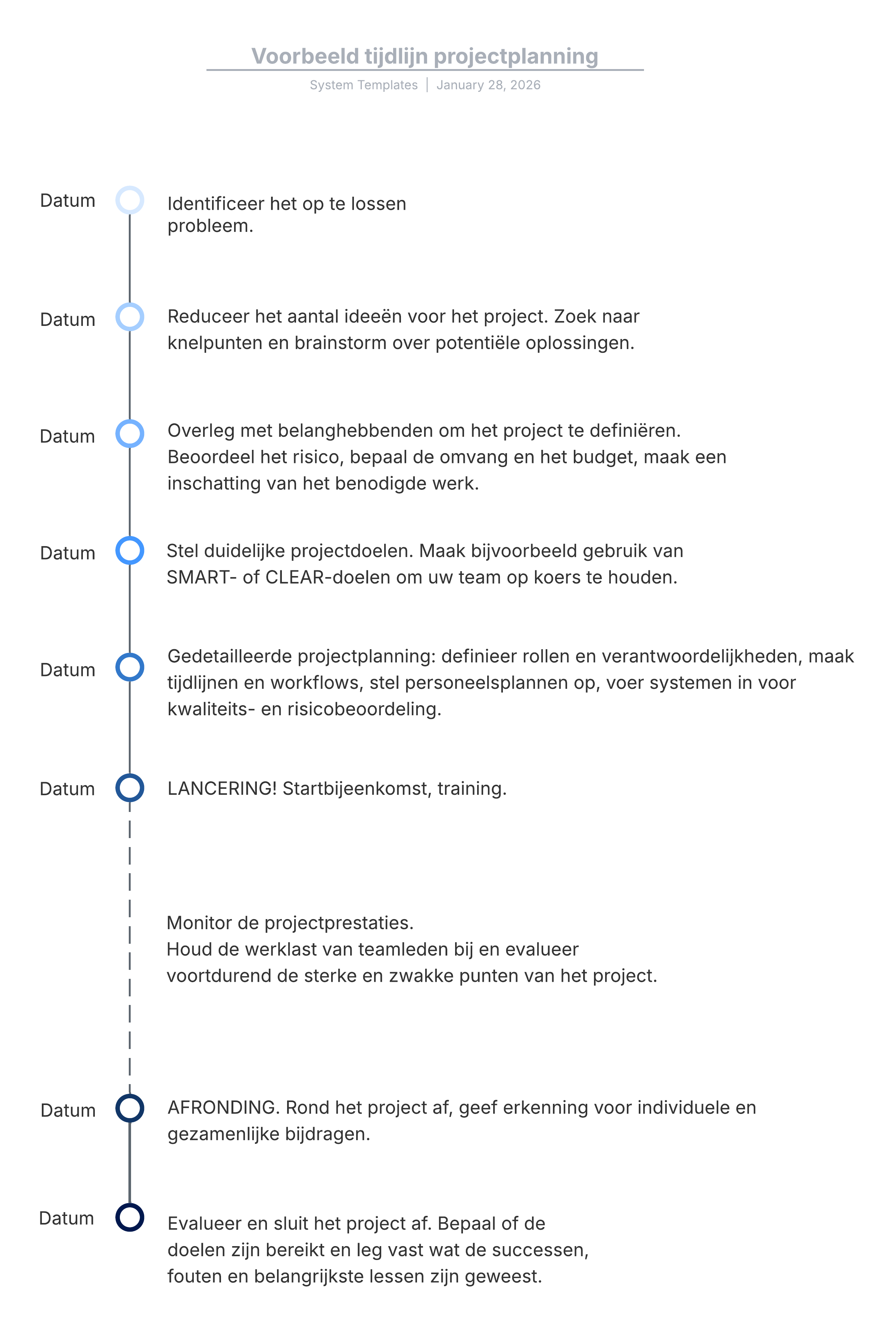 Met dit voorbeeld van een tijdlijn voor een projectplanning kunt u: