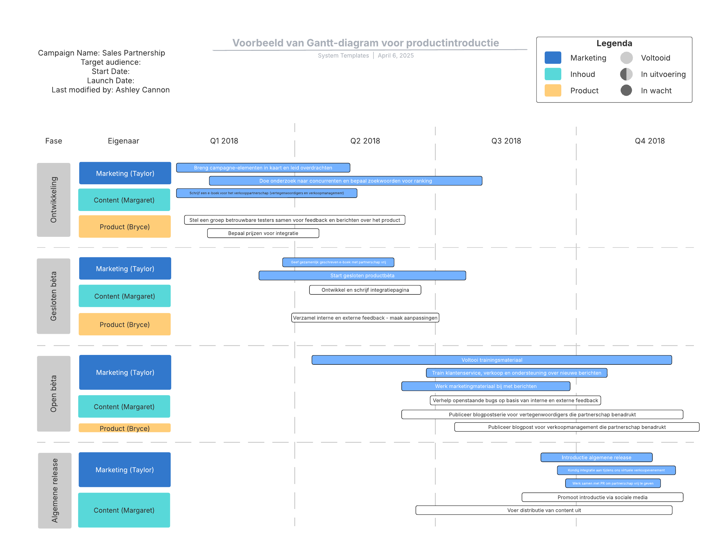 Open deze sjabloon voor een gedetailleerd voorbeeld van een Gantt-diagram voor productintroductie dat u kunt aanpassen op uw use case.