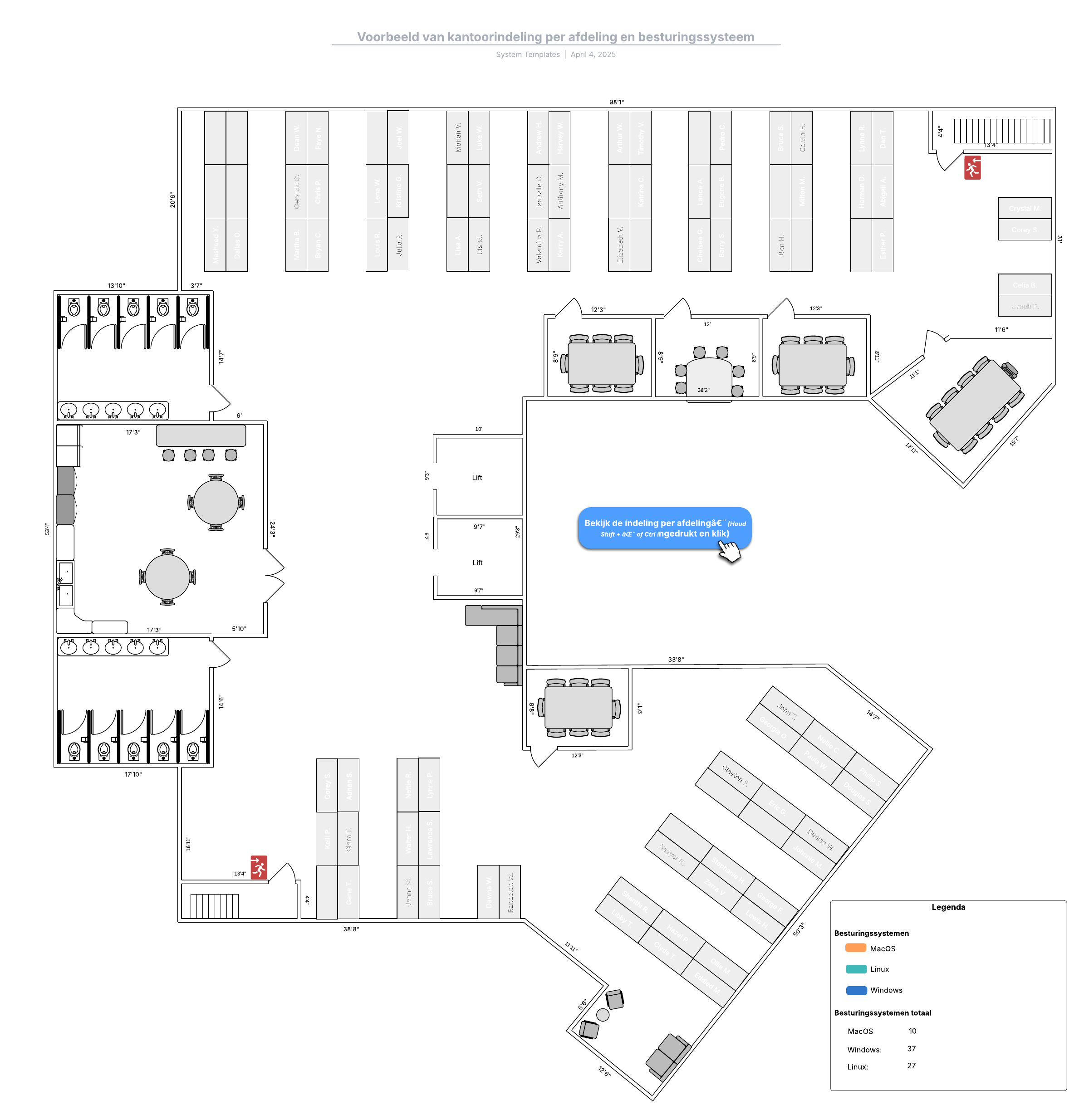 Voorbeeld van kantoorindeling per afdeling en besturingssysteem