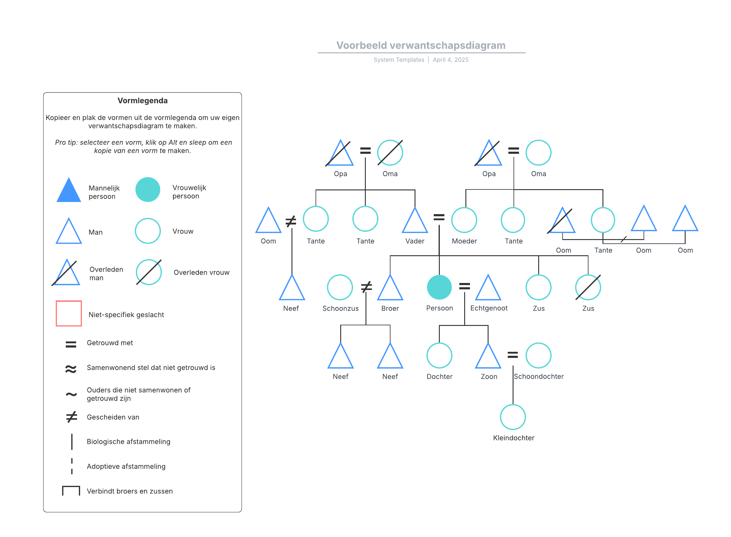 - Gebruikmaken van basissymbolen die worden gebruikt om een verwantschapsdiagram te maken.