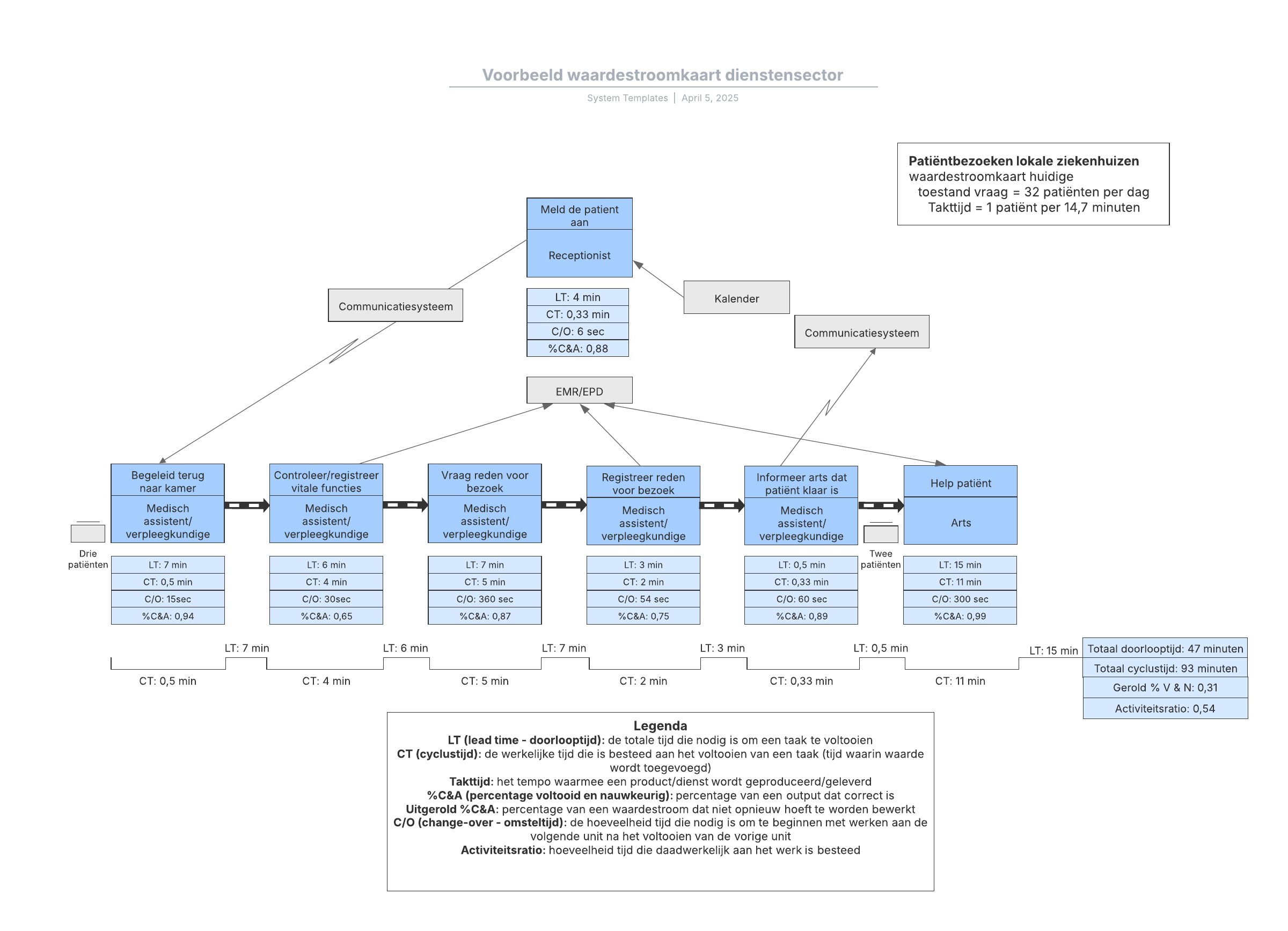 Open deze sjabloon voor een gedetailleerd voorbeeld van een waardestroomkaart (dienstensector) die u aan uw use case kunt aanpassen.