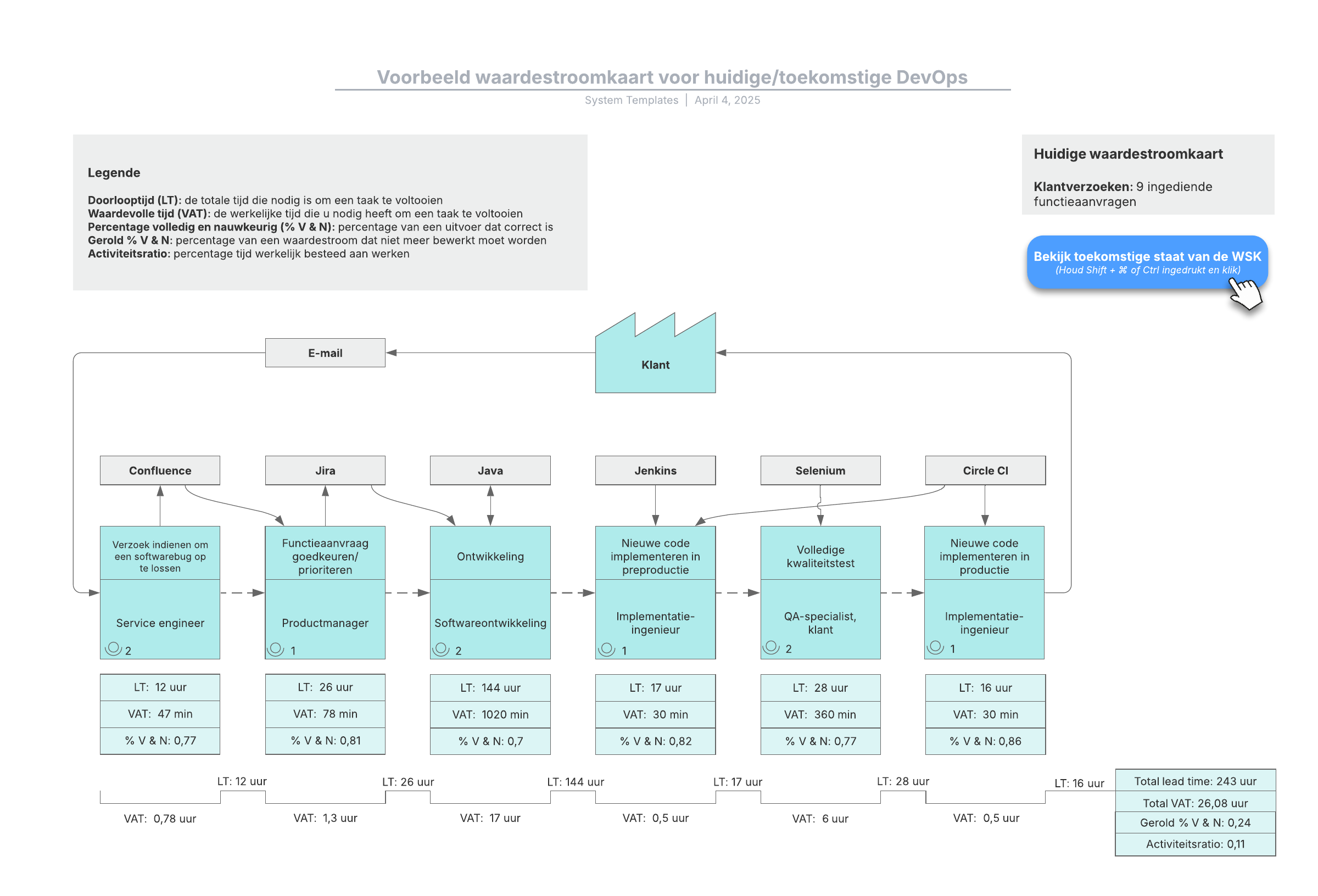 Open dit sjabloon voor een gedetailleerd voorbeeld van een waardestroomkaart voor huidige/toekomstige DevOps die u aan uw eigen use case kunt aanpassen.