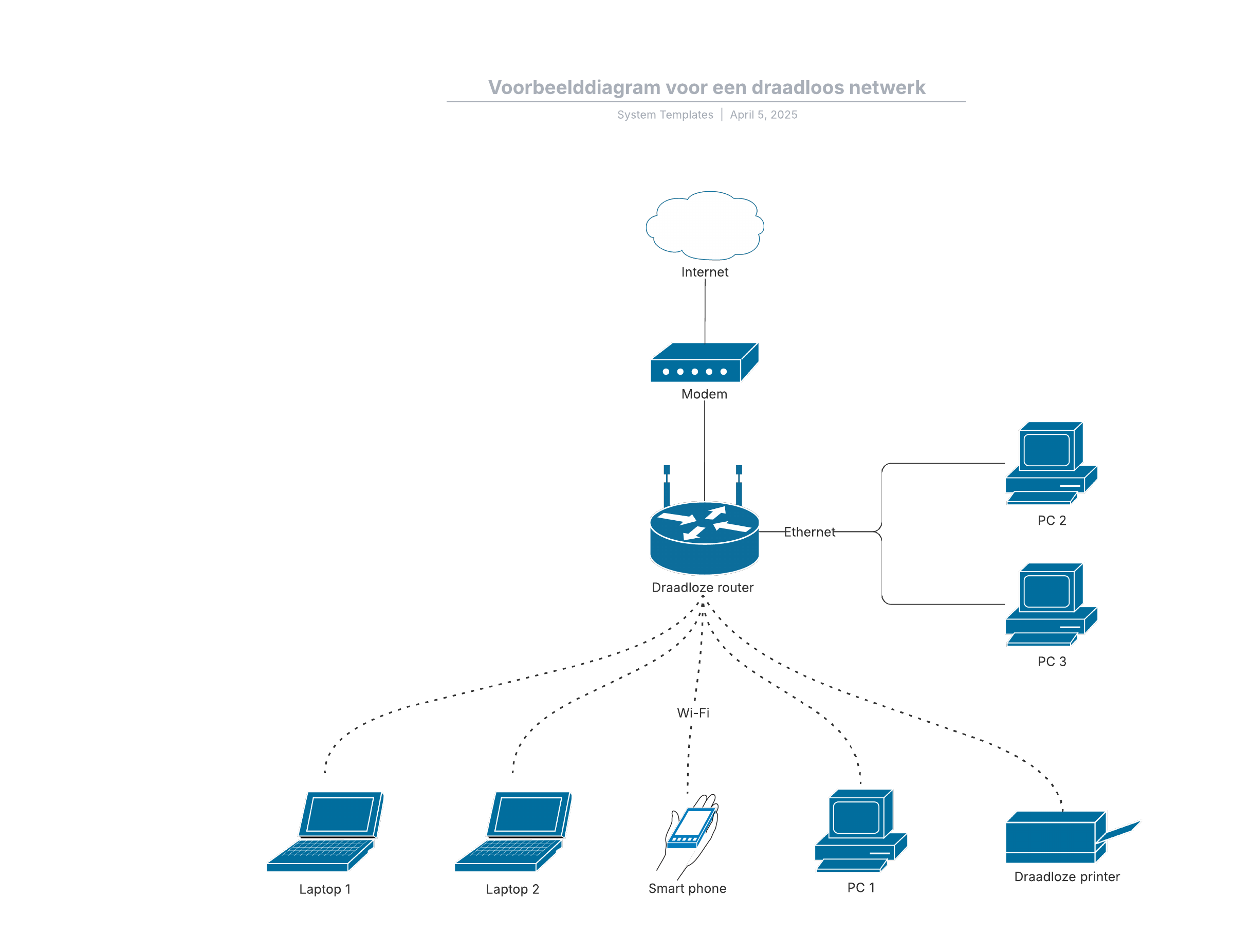 Open deze sjabloon voor een voorbeeld van een draadloos netwerkdiagram dat u kunt aanpassen op uw use case.