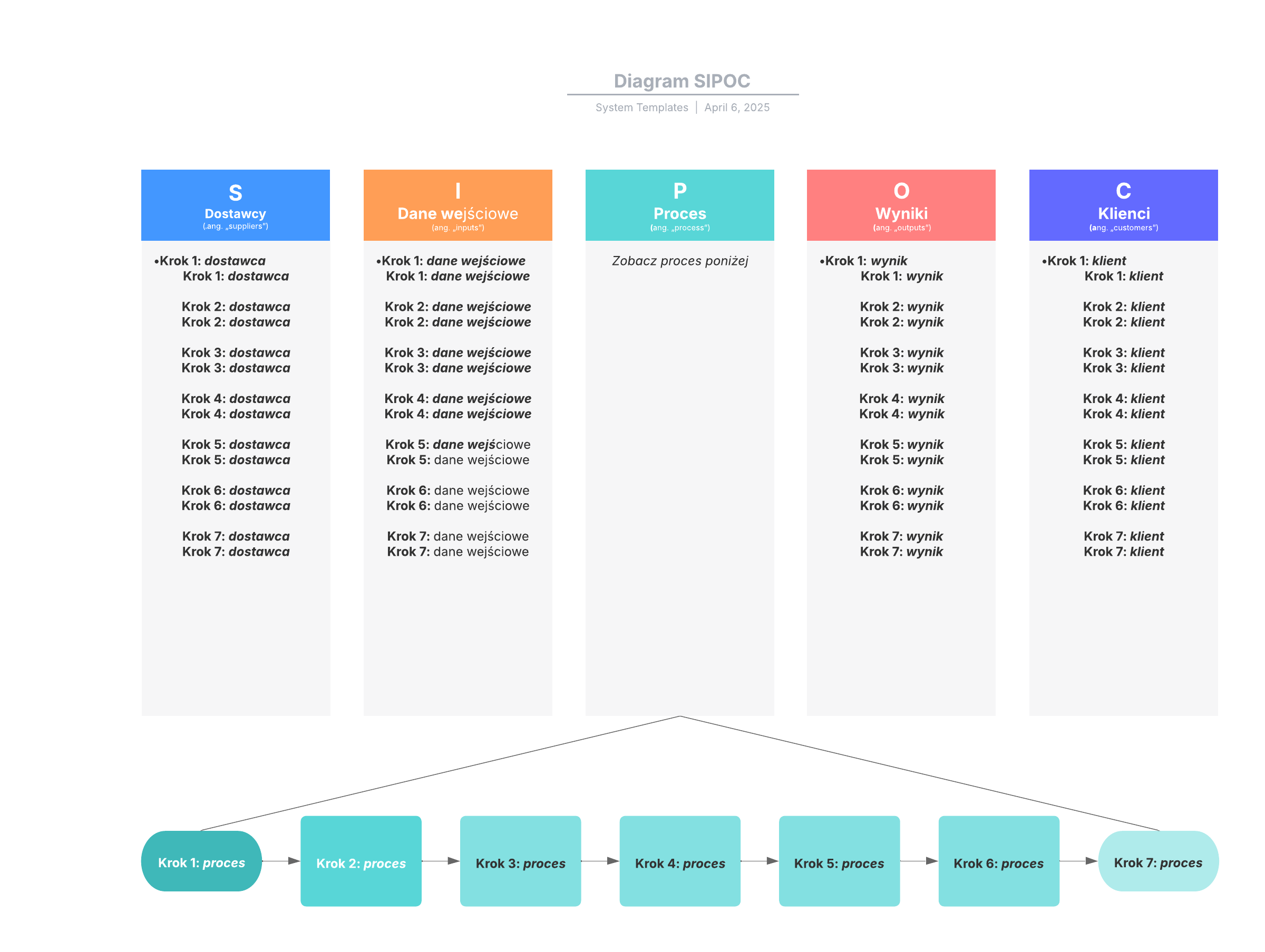 Ten podstawowy przykład diagramu SIPOC (dostawcy, dane wejściowe, procesy, wyniki, klienci) może pomóc:
