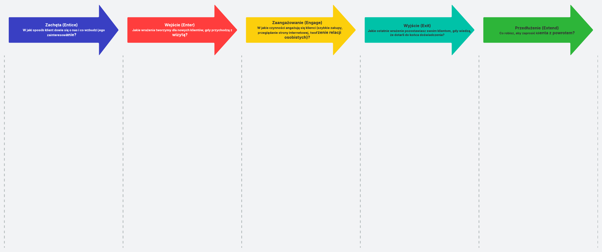Zrozumienie odczuć klienta i jego interakcji z produktem jest kluczem do poprawy wrażeń klienta i jego zatrzymania. Użyj mapy podróży klienta metodą 5E, aby zbadać doświadczenia klientów na następujących pięciu etapach: Entice (zachęta), Enter (wejście), Engage (zaangażowanie), Exit (wyjście) i Extend (przedłużenie).
