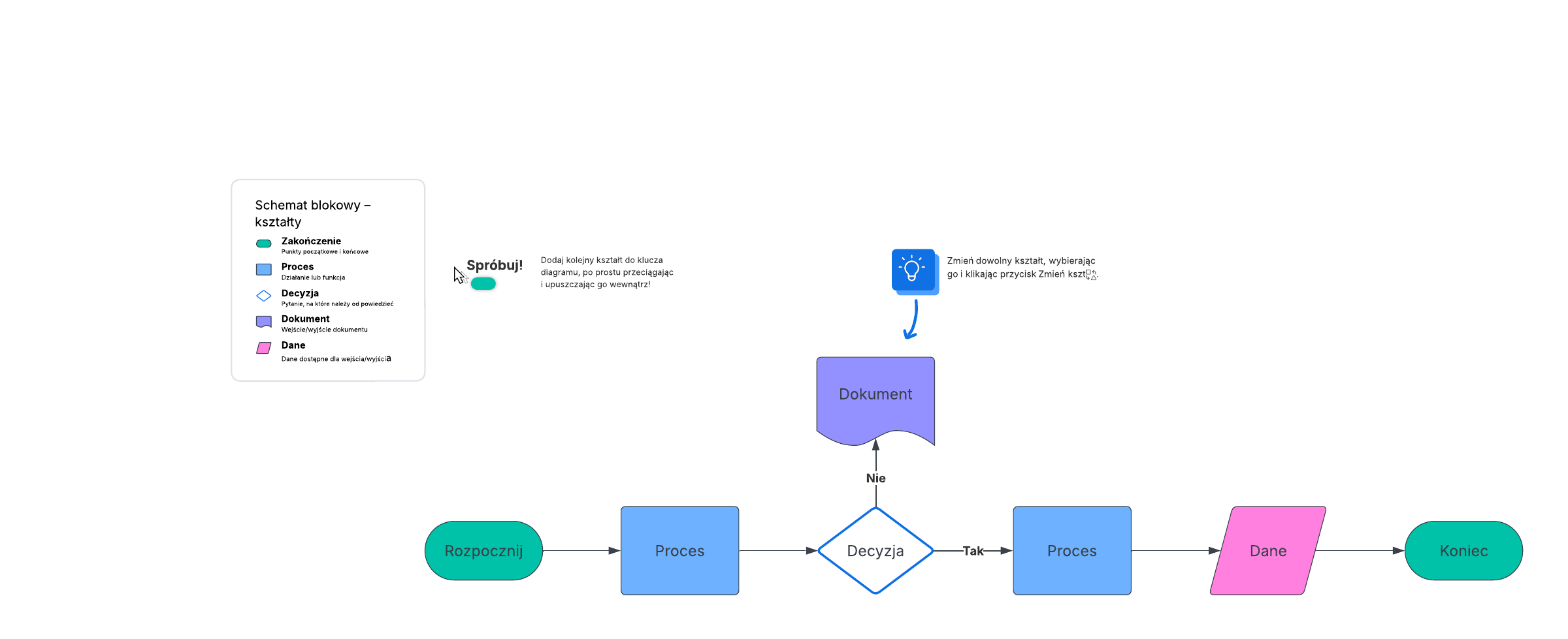 Bezpłatny podstawowy szablon flowchartu doskonale sprawdza się jako wstęp do pracy z flowchartami. Potraktuj go jako plac zabaw – sprawdź go, zapoznaj się z funkcjami Lucidchart i dowiedz się, jak flowcharty mogą ułatwić Twoją pracę.