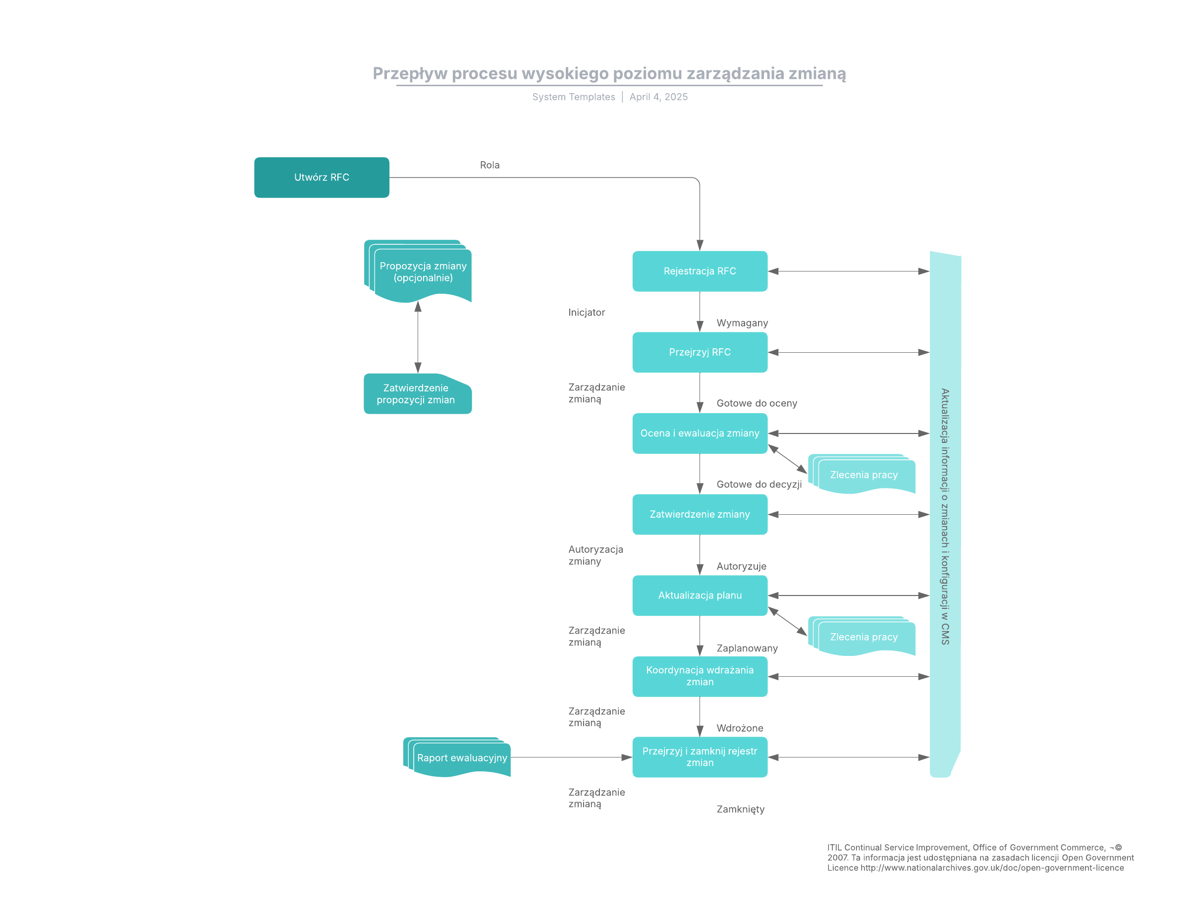 Otwórz ten szablon i dodaj zawartość, aby dostosować przepływ procesu wysokopoziomowego zarządzania zmianą do swojego przypadku użycia.