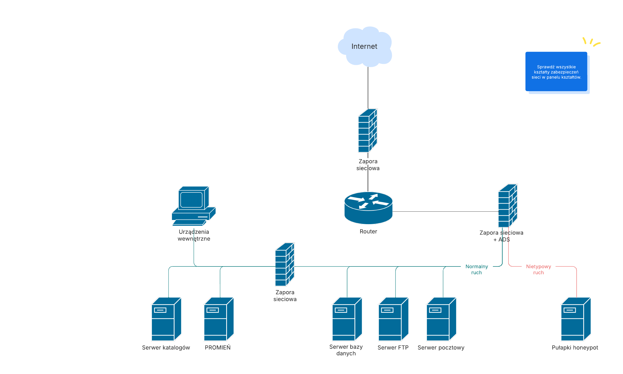 Nasz diagram bezpieczeństwa sieci przedstawia topografię podstawowego układu sieci. Zawiera on strefę DMZ z systemem wykrywania anomalii (ADS) i pułapek honeypot. Zapoznaj się z naszym diagramem, aby utworzyć własny, lub edytuj go bezpośrednio, aby dostosować go dla własnych wymagań.
